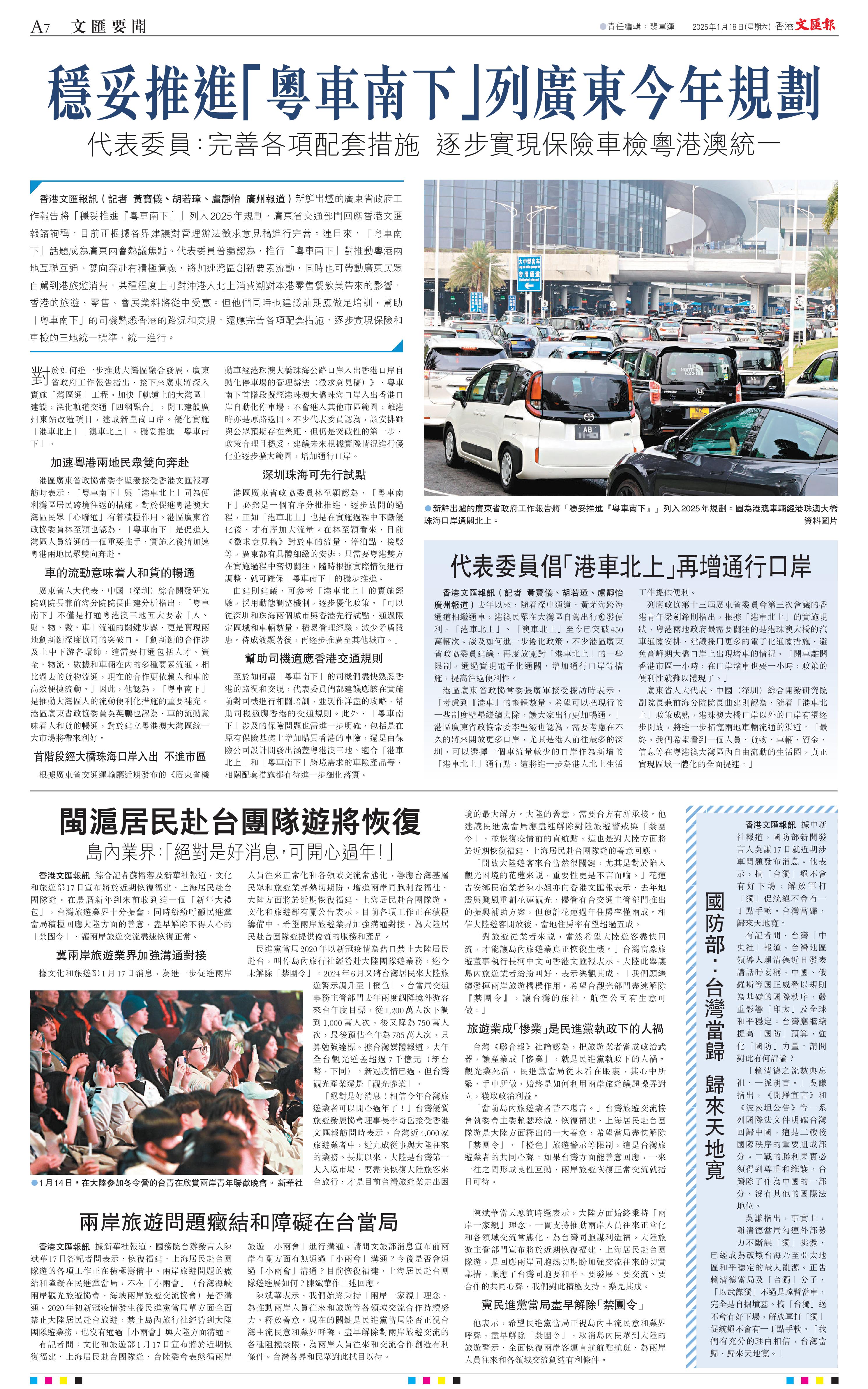 他表示,希望民進黨當局正視島內主流民意和業界呼聲,盡早解除「禁團令」,取消島內民眾到大陸的旅遊警示,全面恢復兩岸客運直航航點航班,為兩岸人員往來和各領域交流創造有利條件。