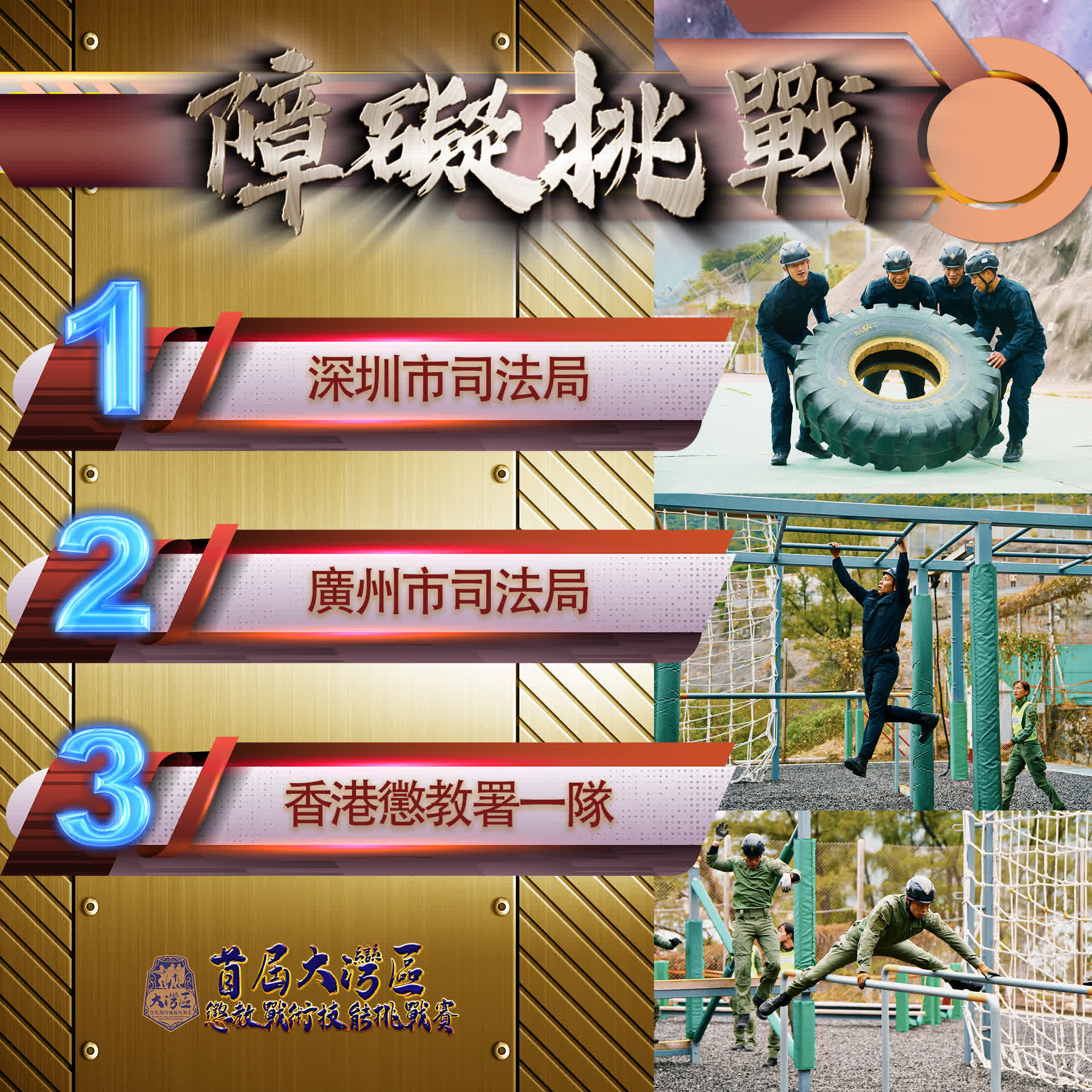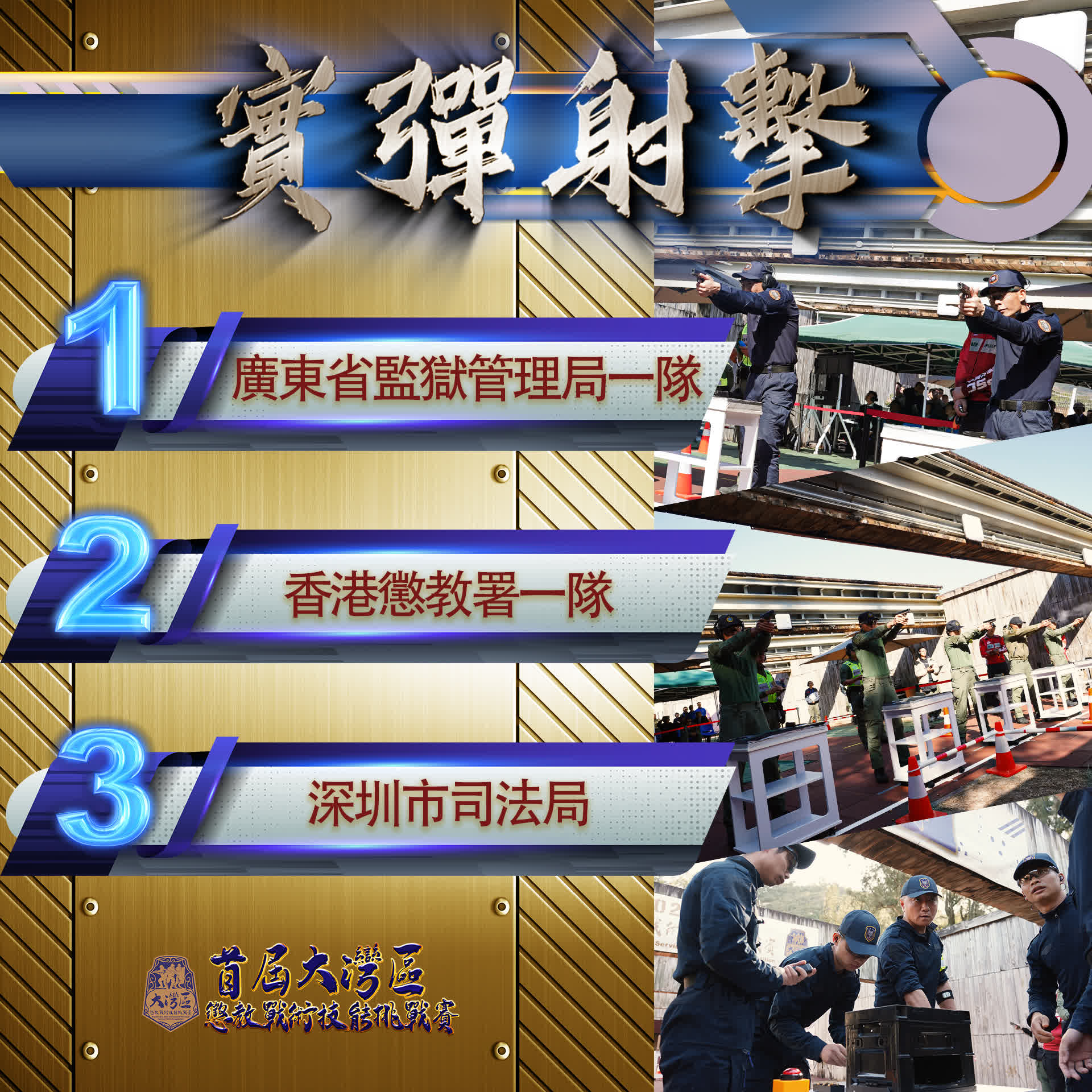 大公文匯全媒體報道:由香港懲教署主辦的首屆「大灣區懲教戰術技能挑戰賽」,昨日(17日)圓滿閉幕!在閉幕儀式上,保安局署理常任秘書長杜潔麗和懲教署署長黃國興分別頒發各個獎項給優勝隊伍。過去數天,參賽隊伍在實彈射擊、障礙挑戰、暴亂處理及搜救行動四個比賽項目互相比拚,一直勢均力敵,不相伯仲。最後,香港懲教署一隊憑穩定的發揮和緊密的團隊合作,勇奪賽事總冠軍,總亞軍及總季軍分別由廣東省監獄管理局一隊和廣州市司法局贏得(獎牌榜見附圖)。