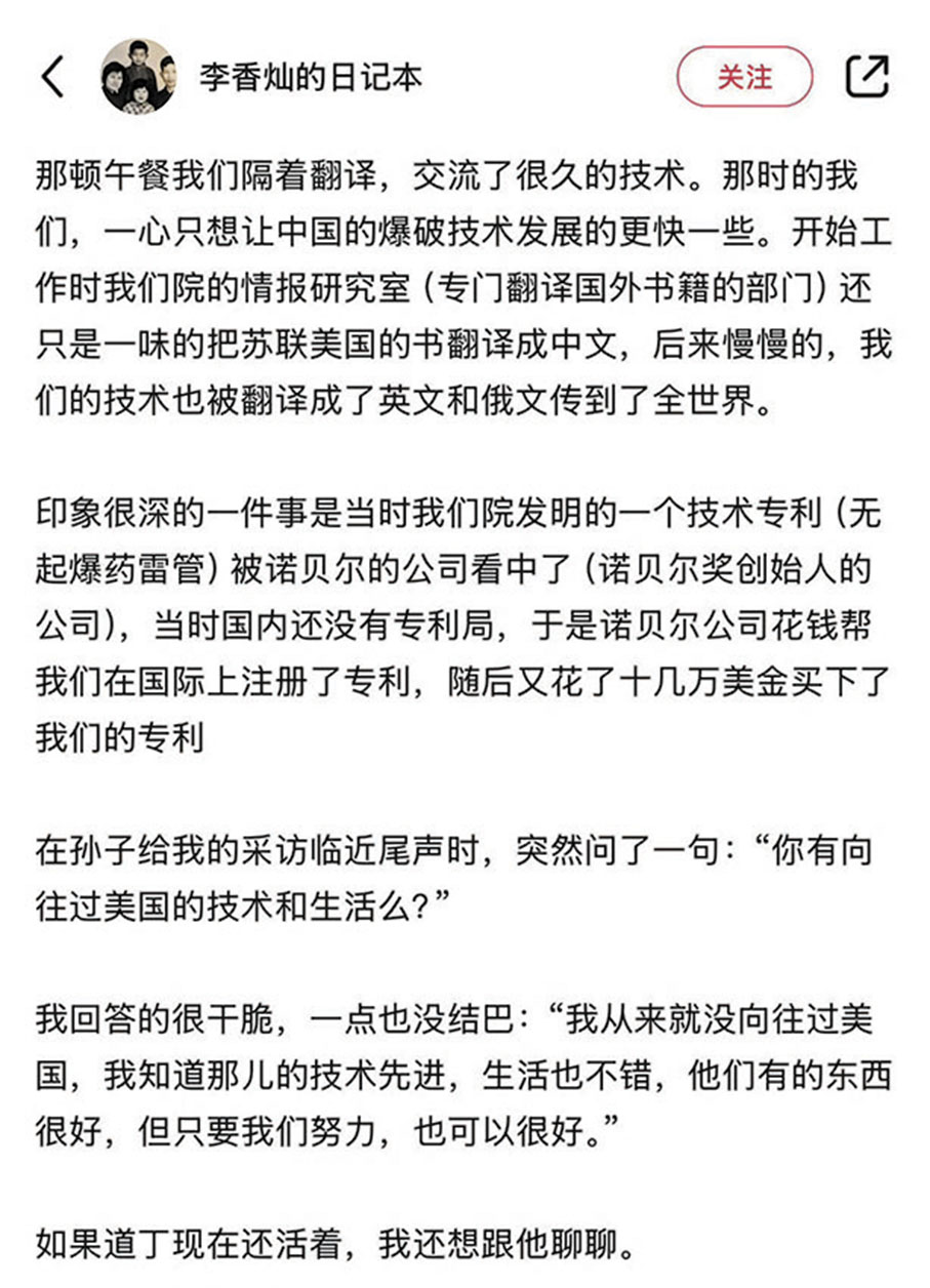 「如果道丁現在還活着,我還想跟他聊聊。」小紅書博主「李香燦的日記本」,是一位名叫李香燦的爆破安全學教授,退休前就職於原冶金部安全環保研究院。他一直在小紅書上發文憶述自己的求學及工作經歷,在其中一篇帖文中,記錄了39年前,他與一位叫道丁的美國教授的交往往事。李香燦回憶,這輩子花最多時間學習的就是英語,每次看資料都必須逐字逐句查字典,自己第一次接觸美國人是1986年,當時他翻譯了一本叫《爆破振動監測與控制》的書,並與從美國來華訪問的原作者道丁有了一次交流。