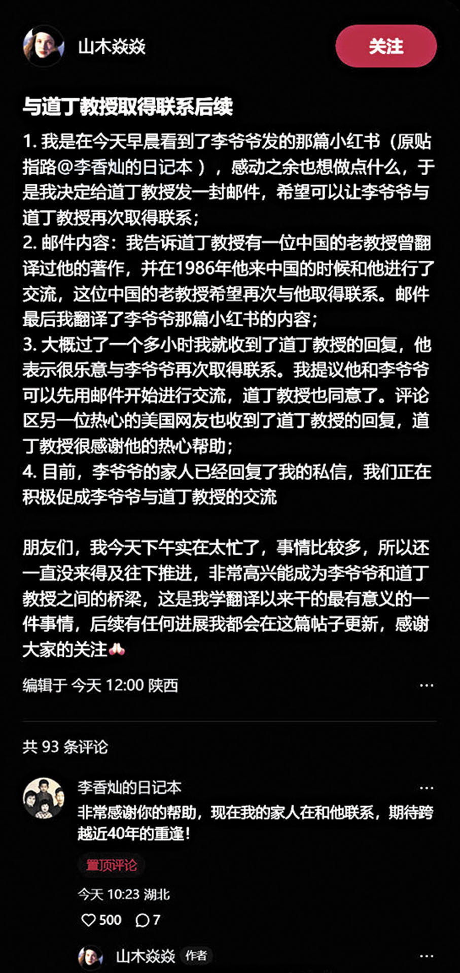 截至香港文匯報記者發稿,李香燦在小紅書回覆網友表示,由於時差原因,暫時還未跟道丁教授聯繫上,但收到了很多熱心網友的幫助,已經獲知了道丁的郵箱,相信很快就會取得聯繫。還有不少網友表示,「我們正在積極促成李爺爺與道丁教授的交流」。