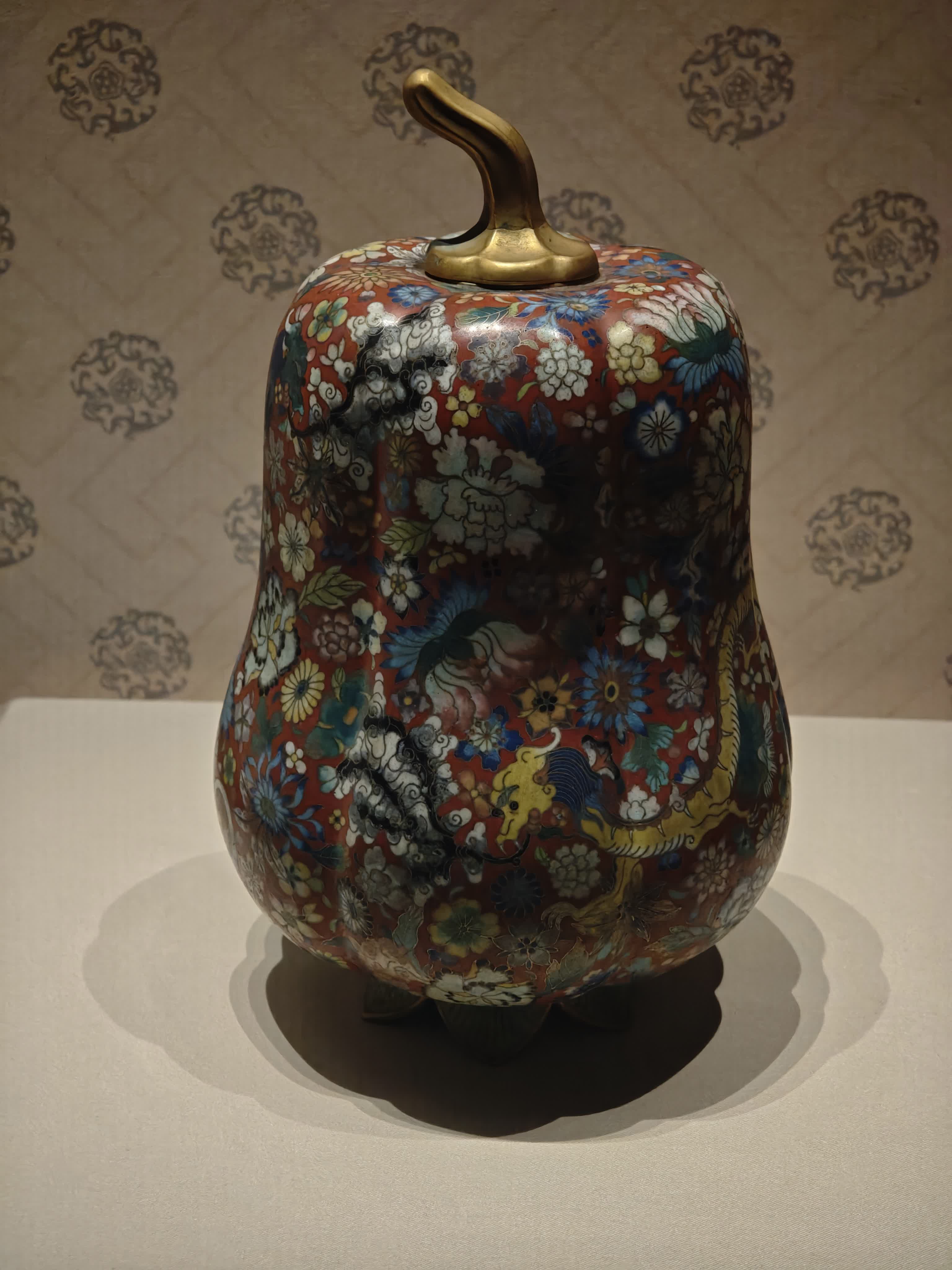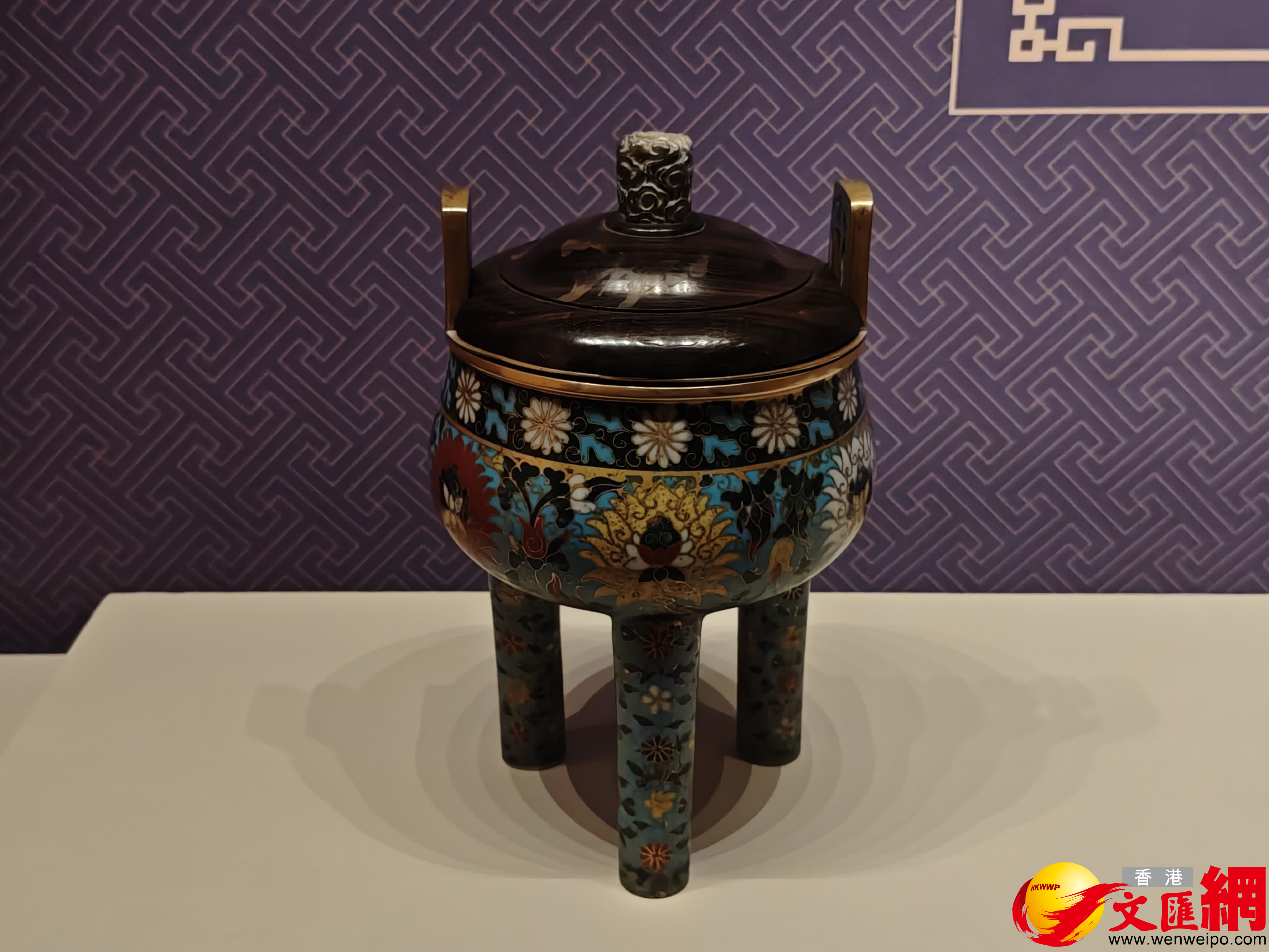 來自元代的掐絲琺琅纏枝蓮紋鼎式爐,為仿古鼎式。其口沿下墨綠色琺琅釉地飾白色菊花紋。腹部施淺藍色琺琅釉,飾纏枝蓮六朵。底為藍釉地飾纏枝菊花紋,雙耳及柱足飾梅、菊等花卉。通體共用淺藍、墨綠、紅、白、紫、黃六色,釉色艷麗,晶瑩細潤,具有元代釉色特徵。