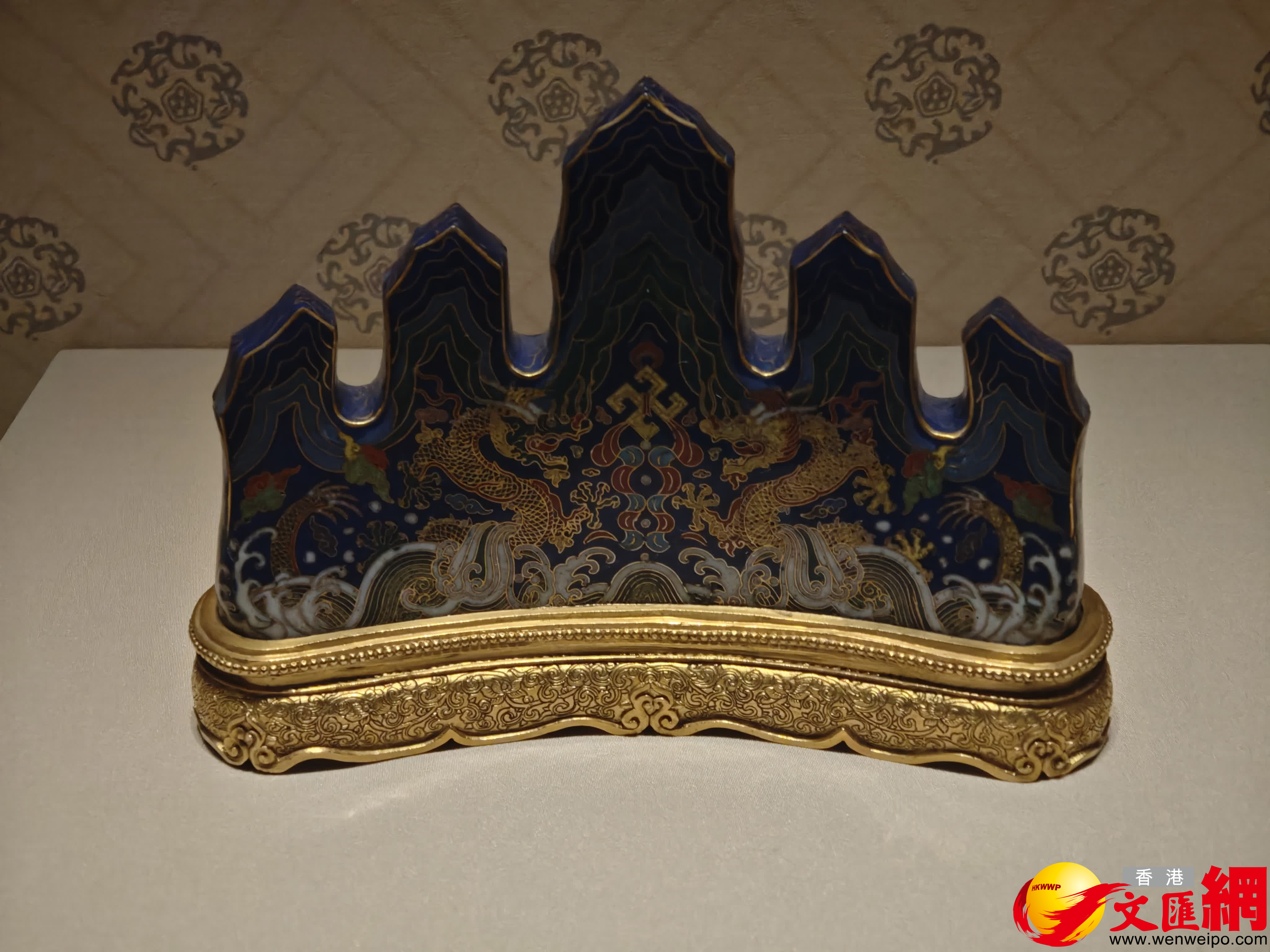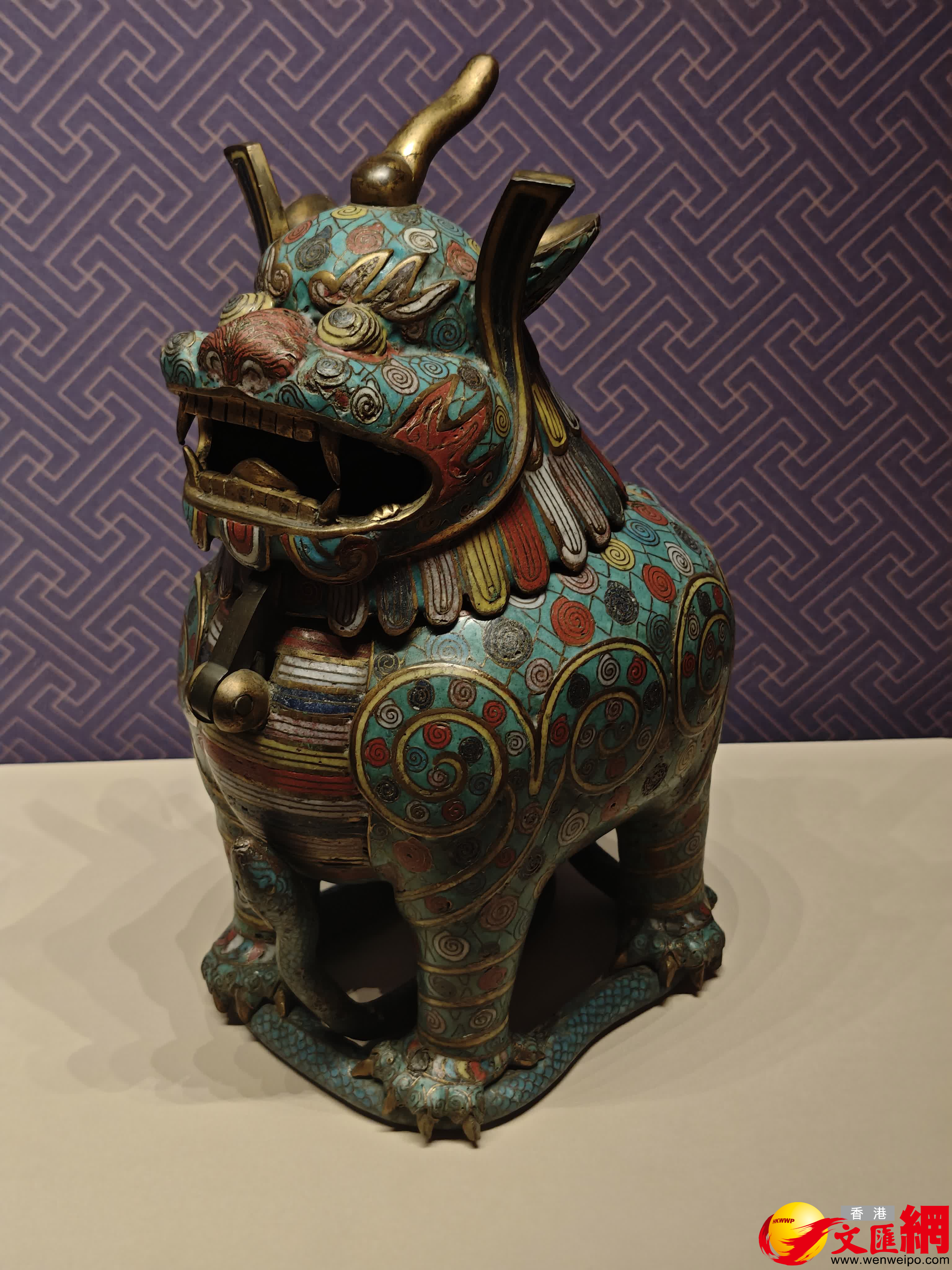 展覽特闢元明時期的琺琅器展區,展品精品眾多,存世量稀少,都是難得一見的珍品,如元代的爐和香薰,明代的花觚和甪端,都是極具代表性的器物。琺琅器的發展巔峰——乾隆朝琺琅器是此次展覽的重點,掐絲琺琅、畫琺琅精品均有展出,尤其是在展廳內還原了一套清宮正殿的琺琅器傢具使用場景。記者在現場看到,一款甪端(中國古代神話傳說中的一種神獸,形象獨特,結合了多種動物的特徵,包括犀角、獅身、龍背、熊爪、魚鱗和牛尾,能夠日行一萬八千里,通曉四方語言,並且只陪伴明君,專為英明帝王傳書護駕,頻繁出現在各種器物中),其頭部與身體有活栓相連,闊口大張,用於出煙;腹部中空,可以燃燒香料;四足踩於盤蛇之上,通體掐絲琺琅為飾,填以紅、藍、黃、白、紫各色;頭部內側後方有雙線陰刻「大明萬曆年造」款。