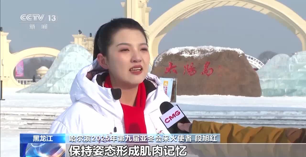 哈爾濱2025年第九屆亞冬會採火使者 段旭紅:每天站立、走步都端着採火棒,保持姿態形成肌肉記憶。晚上回到宿舍,我們幾個小夥伴在一起面對面找各自缺點,自己再進行加練。每一天都會感覺自己從步伐到姿態都會有所提升。我本身也是學習國際經濟與貿易的,在這種大型的國際賽事中,開闊了我的眼界,我希望把亞冬會當作一個開始,以後多多參與到這種國際交流活動當中。