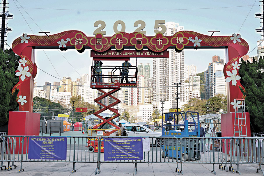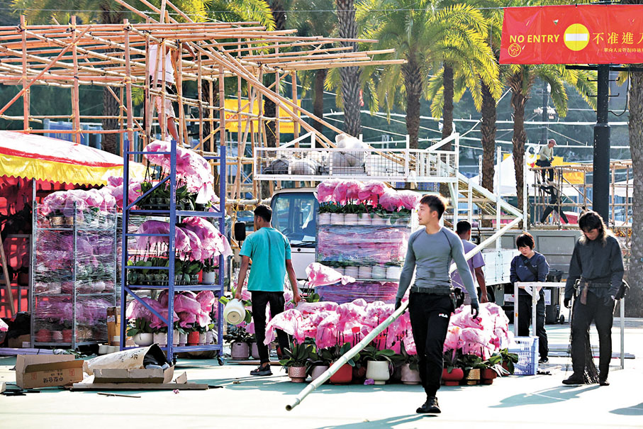 香港文匯報記者昨日率先直擊維園年宵市場,甫踏進入口處,迎面而來是一幅由建築署特別設計的蛇年迎賓牌匾,設計突顯蛇的敏捷形態,並以紅金色為主調,象徵喜慶與吉祥,料能吸引不少市民停下拍照留念。場內,工人們正在密鑼緊鼓搭建攤檔的棚架,各種賀年花卉如水仙、桃花、年桔等已陸續從批發市場運抵,部分檔主甚至已經開始精心布置攤位。