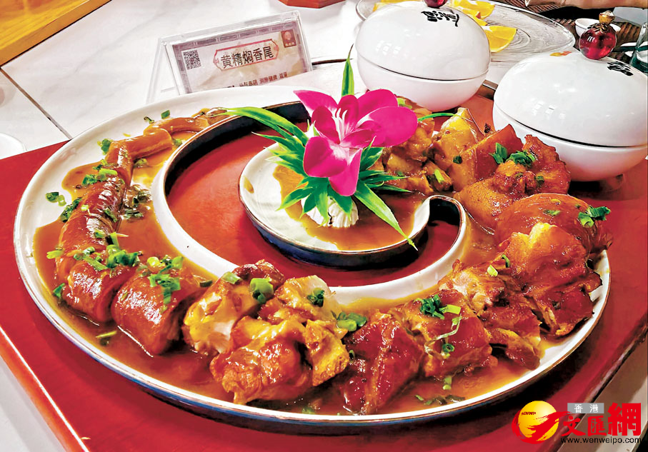 第二道菜,黃精燜香尾。這道藥膳以黃精配牛尾,極適合脾腎虛弱之人群。還加入了「桂十味」藥材,更具有健脾益氣、補腎強筋之功效,肉質Q彈,在擺盤上更是蘊含富川「炸龍節」的傳統文化。