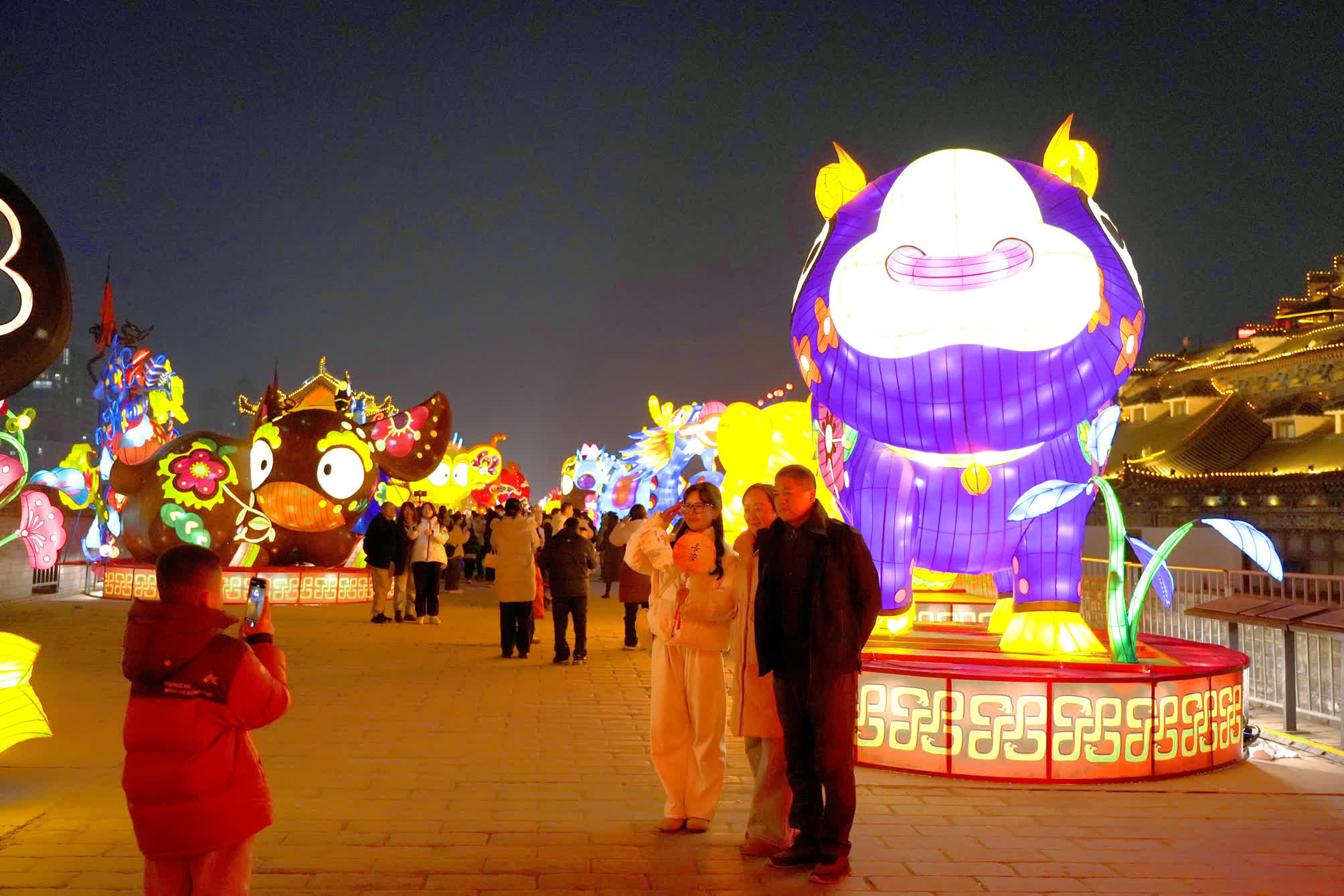 「以前只是在《長安三萬里》和《長安十二時辰》這樣的影視劇中,看到過藝術化的千年前大唐長安滿城彩燈的盛世盛景,今天卻在現實中又看到了那震撼的一幕。」來自上海的遊客劉女士表示,這些花燈不僅精美,同時還集趣味、年味、文化味為一體。「比如『燈耀千宮』還原了唐代榫卯結構,『九天閶闔』則重現含元殿之雄偉,還有西安城牆上的國寶文物彩燈,都已經突破了傳統花燈的概念。」劉女士告訴記者,再加上現場的歷史場景巡遊以及主題演出,還有非遺糖畫和唐風美食,濃郁的盛唐氛圍中讓人一秒「步入」長安城。