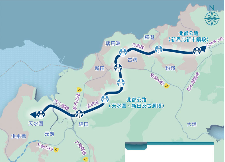 連接天水圍至新界北坪輋、全長23公里的北都公路,分為天水圍段、新田段、古洞段,及新界北新市鎮段,特區政府早前向立法會申請11.34億元撥款作前期勘查工作,包括約3.3億元顧問費用、約6.5億元工地勘測費等,料需時38個月,當時已被議員質疑勘查又貴又「龜速」。