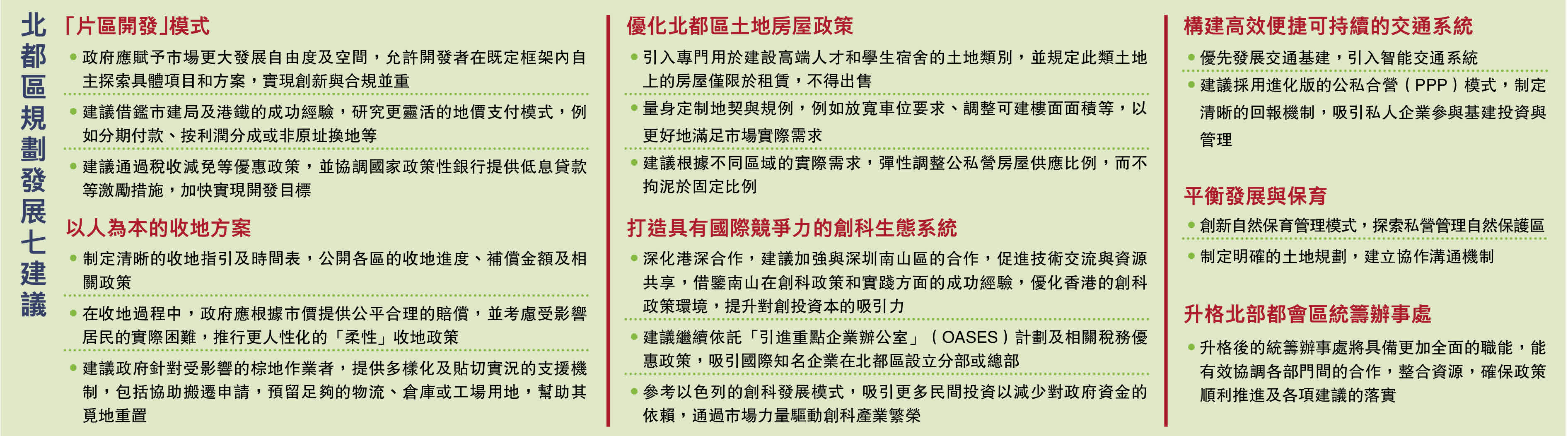 (香港文匯報記者 蔡競文)北部都會區是香港未來發展的新引擎,目前正就「片區開發」試點諮詢市場建議。全國工商聯房地產商會香港及國際分會(CRECCHKI)與香港房地產協會(HKRPF)聯合組成的「北部都會區政策研究小組」,昨日就北都區的規劃及發展提出七大方面建議,當中包括建議賦予開發者在既定框架內自主探索具體項目、研究更靈活地價支付模式、優化北都區土地政策、構建高效交通基建、打造具國際競爭力創科生態等,希望有項目能盡快有序開展。