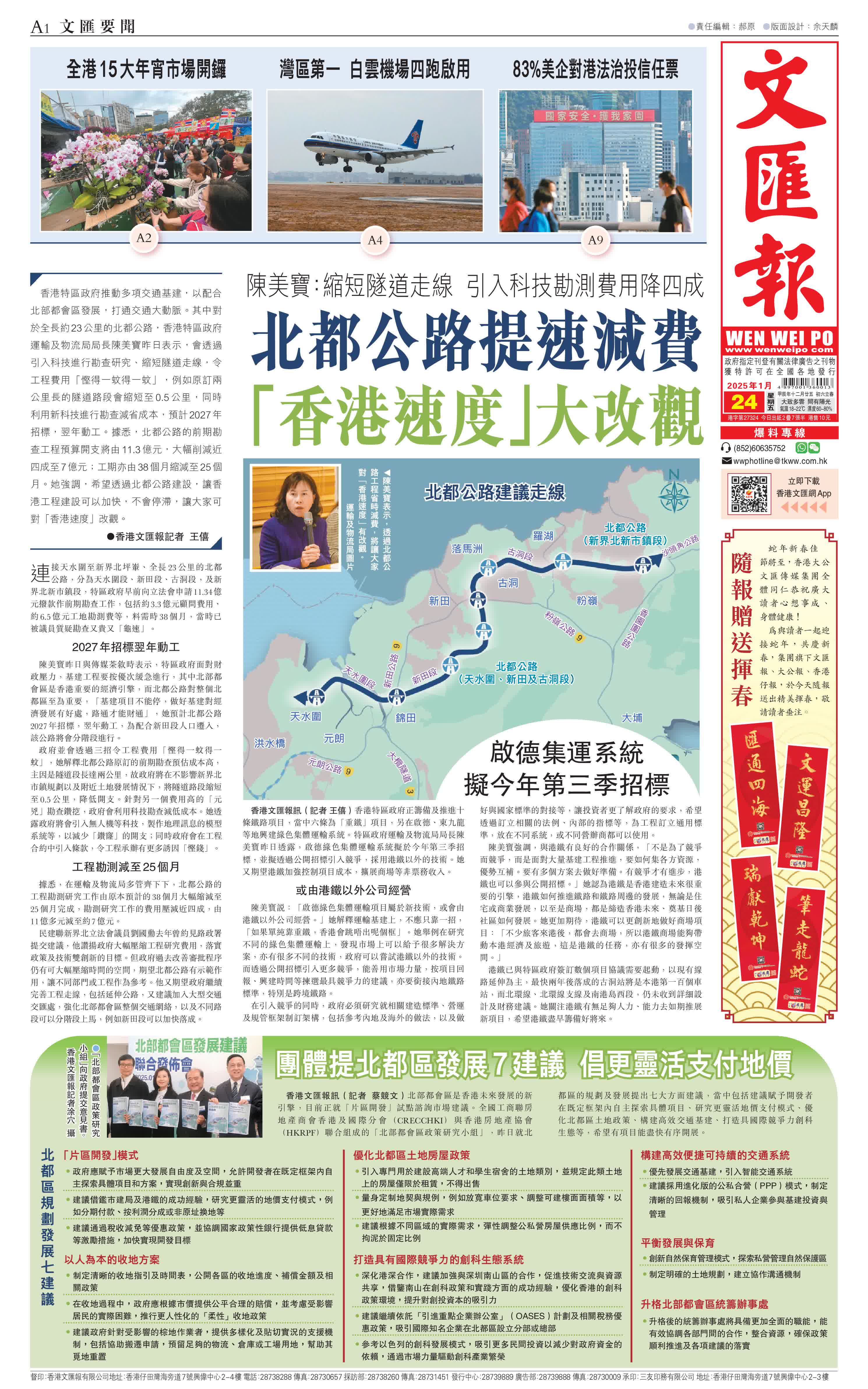 (香港文匯報記者 王僖)香港特區政府推動多項交通基建,以配合北部都會區發展,打通交通大動脈。其中對於全長約23公里的北都公路,香港特區政府運輸及物流局局長陳美寶昨日表示,會透過引入科技進行勘查研究、縮短隧道走線,令工程費用「慳得一蚊得一蚊」,例如原訂兩公里長的隧道路段會縮短至0.5公里,同時利用新科技進行勘查減省成本,預計2027年招標,翌年動工。據悉,北都公路的前期勘查工程預算開支將由11.3億元,大幅削減近四成至7億元;工期亦由38個月縮減至25個月。她強調,希望透過北都公路建設,讓香港工程建設可以加快,不會停滯,讓大家可對「香港速度」改觀。
