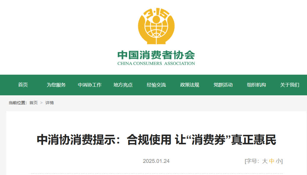 據中消協官網消息,24日,中消協針對消費券發布消費提示,督促有關經營主體遵守法律法規和商業道德,合法合規誠信經營,保障消費券發放的正常秩序,切實維護消費者合法權益。同時,要履行資格審查義務,加強消費券發放管理,抵制「黃牛」二手交易,不得通過虛構交易等違規方式套取補貼。