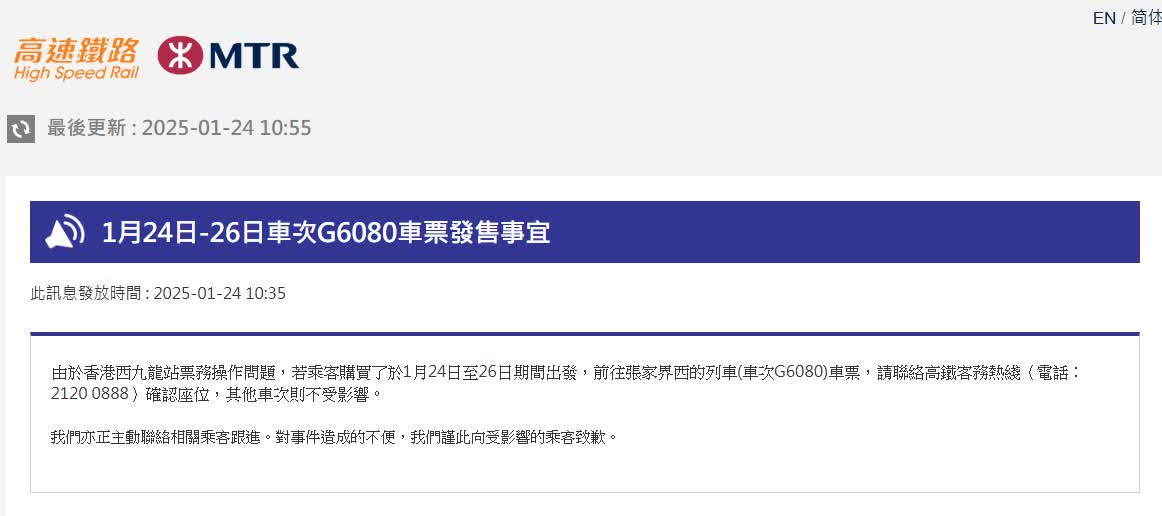 大公文匯全媒體報道,港鐵今日(24日)公布,由於香港西九龍站票務操作問題,若乘客購買了於1月24日至26日期間出發,前往張家界西的列車(車次G6080)車票,請聯絡高鐵客務熱線(電話:2120 0888)確認座位,其他車次則不受影響。