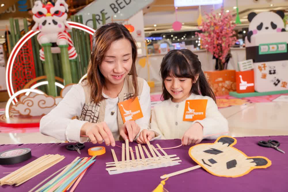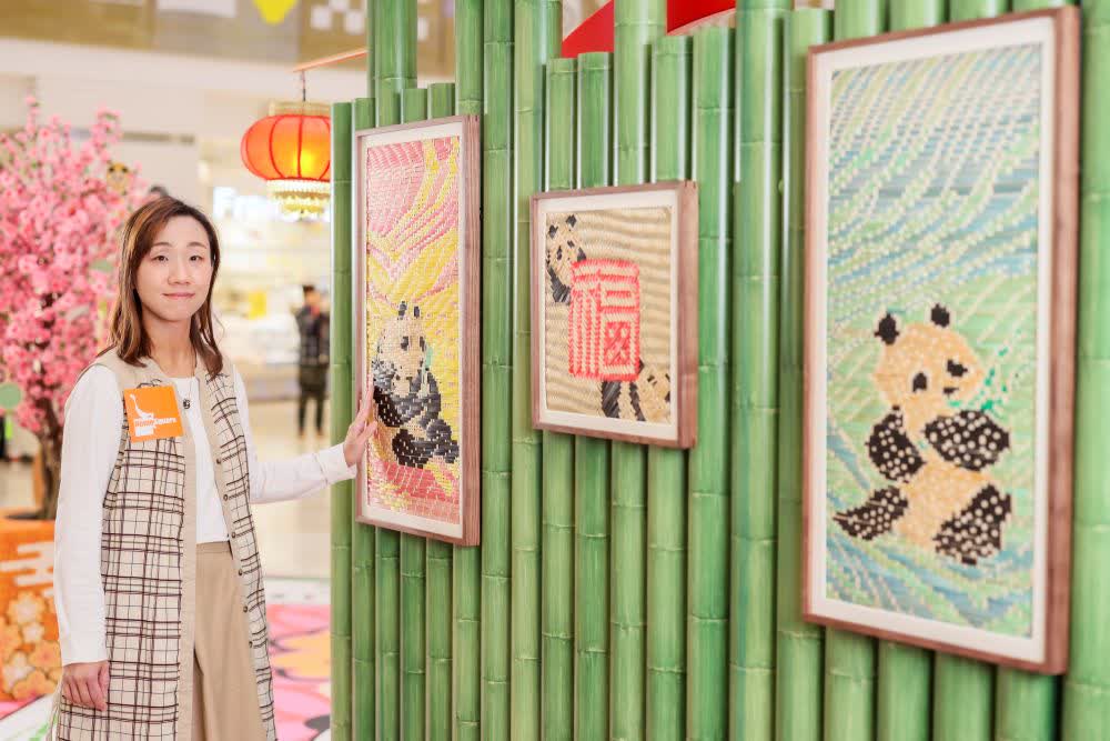 透過竹編技術令熊貓與竹葉融為一體,以水墨風格國畫為靈感,精心編織出一對熊貓竹編畫,更以熊貓頭圖案編成「福」字竹揮春,畫中熊貓呈現不同可愛形態,配合商場的竹林背景為香港六隻熊貓獻上滿滿的新春祝福。另外,竹藝師更打造熊貓造型的竹編吊飾掛滿在中庭的桃花樹,一個個的熊貓造型竹編吊飾向大家「拜年」為新年招財納福。同場更設有親子熊貓竹編扇工作坊,讓大眾一同認識這項非物質文化遺產,親手製作自己的竹編扇,一起體會民間工藝的精妙之處,將「竹」福帶到家中。