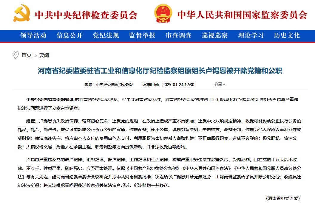 據河南省紀委監委消息:經中共河南省委批准,河南省紀委監委對駐省工業和信息化廳紀檢監察組原組長盧錫恩嚴重違紀違法問題進行了立案審查調查。