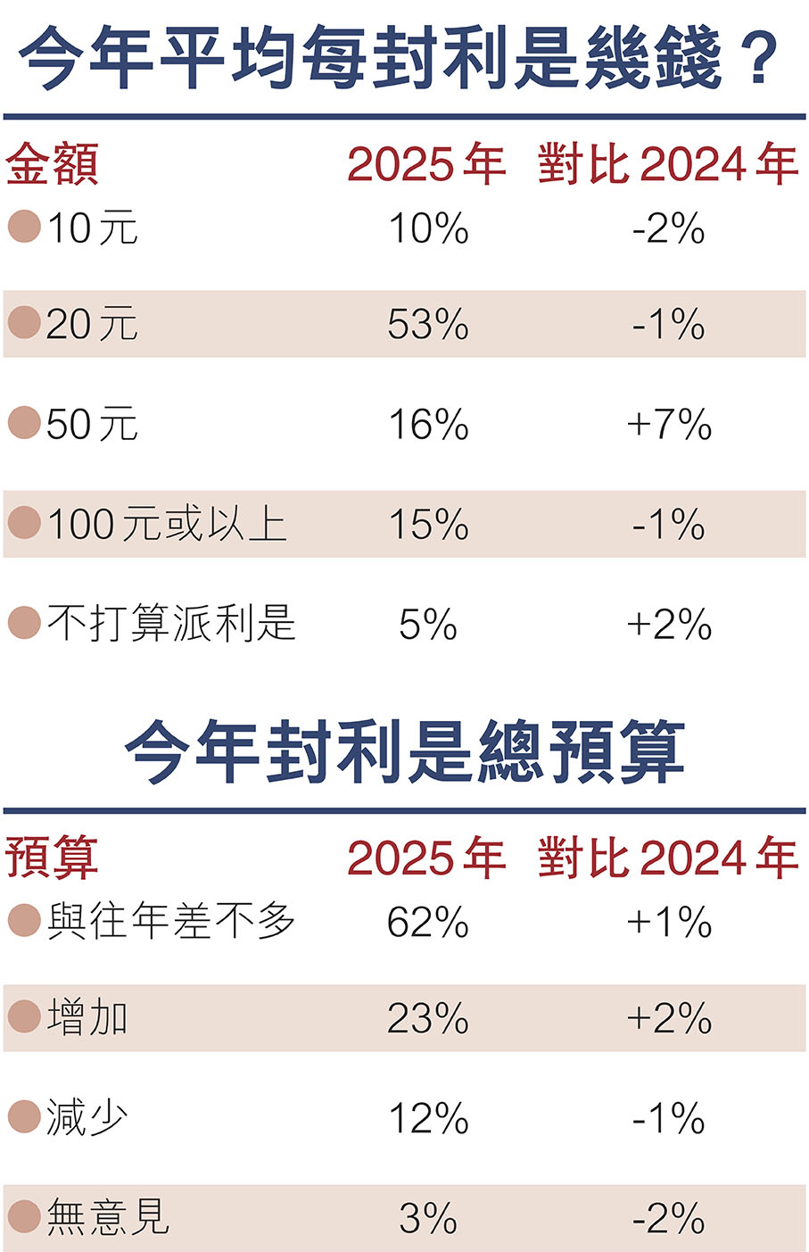在利是金額的變化方面,有23%受訪者預計今年封利是的總金額會較去年增加,62%的利是預算與去年相若,表示減少預算的佔12%,跌1個百分點,餘下受訪者表示「無意見」。
