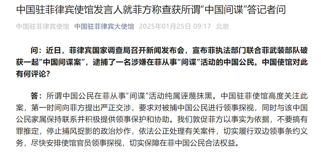 據中國駐菲律賓大使館微信公眾號25日消息,中國駐菲律賓使館發言人就菲方稱查獲所謂「中國間諜」答記者問。