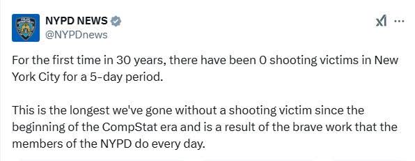 紐約警察局稱,這是警方自1990年代開始使用電腦統計各類案件以來,當地「持續無槍擊受傷」最久的一次,是「紐約警方每天勇敢工作的成果」。