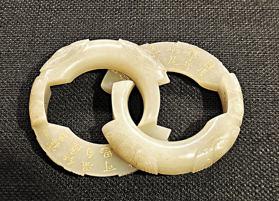 乾隆時期,文人雅士追古、嗜古之風尤盛。乾隆喜愛以玉仿製青銅器,既有造型仿古,也有紋飾仿古、風格仿古及仿古意者。如今次展出的乾隆御題青玉獸耳活環鳧魚紋壺就仿自青銅「漢鳧魚壺」,乾隆御題青玉百獸紋豆仿《欽定西清古鑒》所繪青銅「周百獸豆」而製。乾隆皇帝在諭令製作仿古玉器時,雖參照《欽定西清古鑒》所錄,或許還會直接參考青銅器原件,但也會根據自身喜好或玉料實際情況,在原器基礎上作適當調整。專家表示,乾隆皇帝大量製作仿古玉器,既是對文人尚古、慕古思想的認同,也是其追求古樸風雅之美和「進德」「精藝」「與古人相見」之境界的體現。