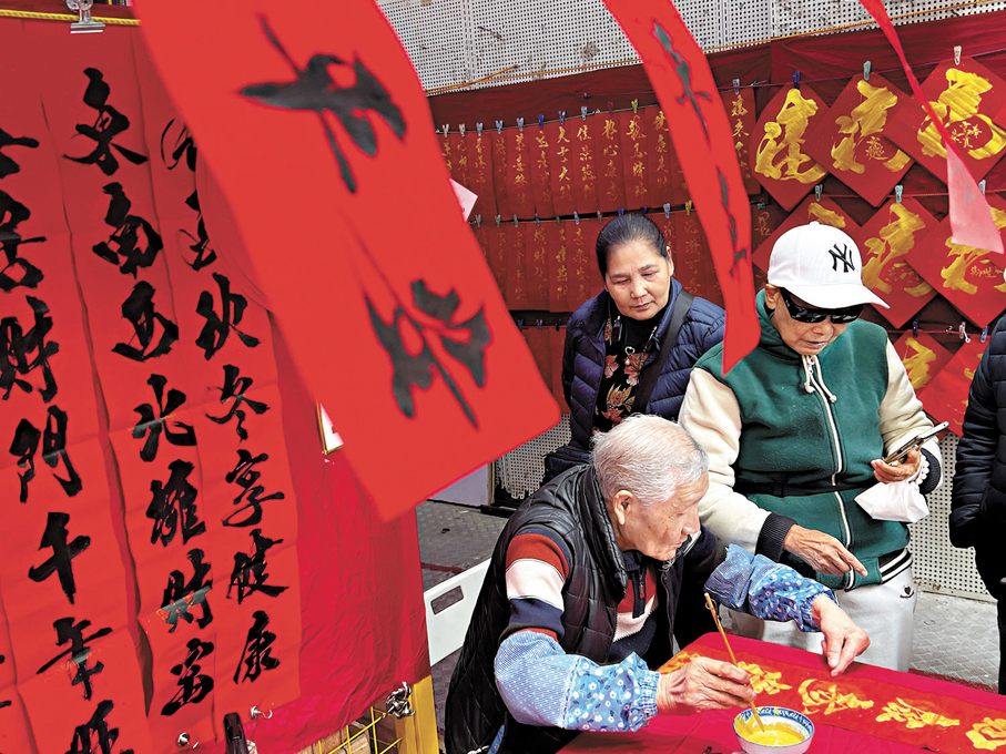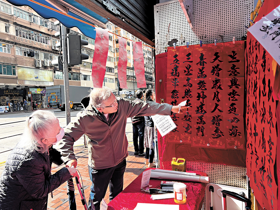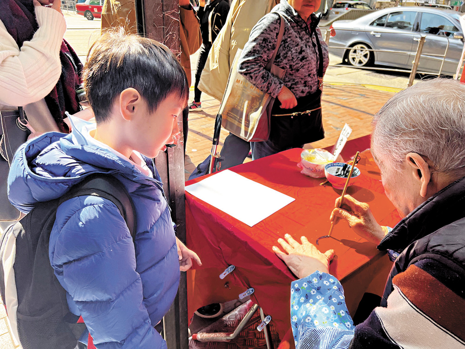 「陳老師,身體健康啊!」一位女士笑盈盈地和陳鑫發打招呼,像是十分熟稔的老朋友,「我年年都找陳老師寫幾副揮春,以前在灣仔、銅鑼灣、深水埗,這兩年到了北角。」這位何小姐還與香港文匯報分享起她買手寫揮春的緣由。吸引她的除了「這字寫得有精氣神」,還有她對傳統文化的熱愛,「過年貼揮春是傳統,毛筆字更是傳統。」