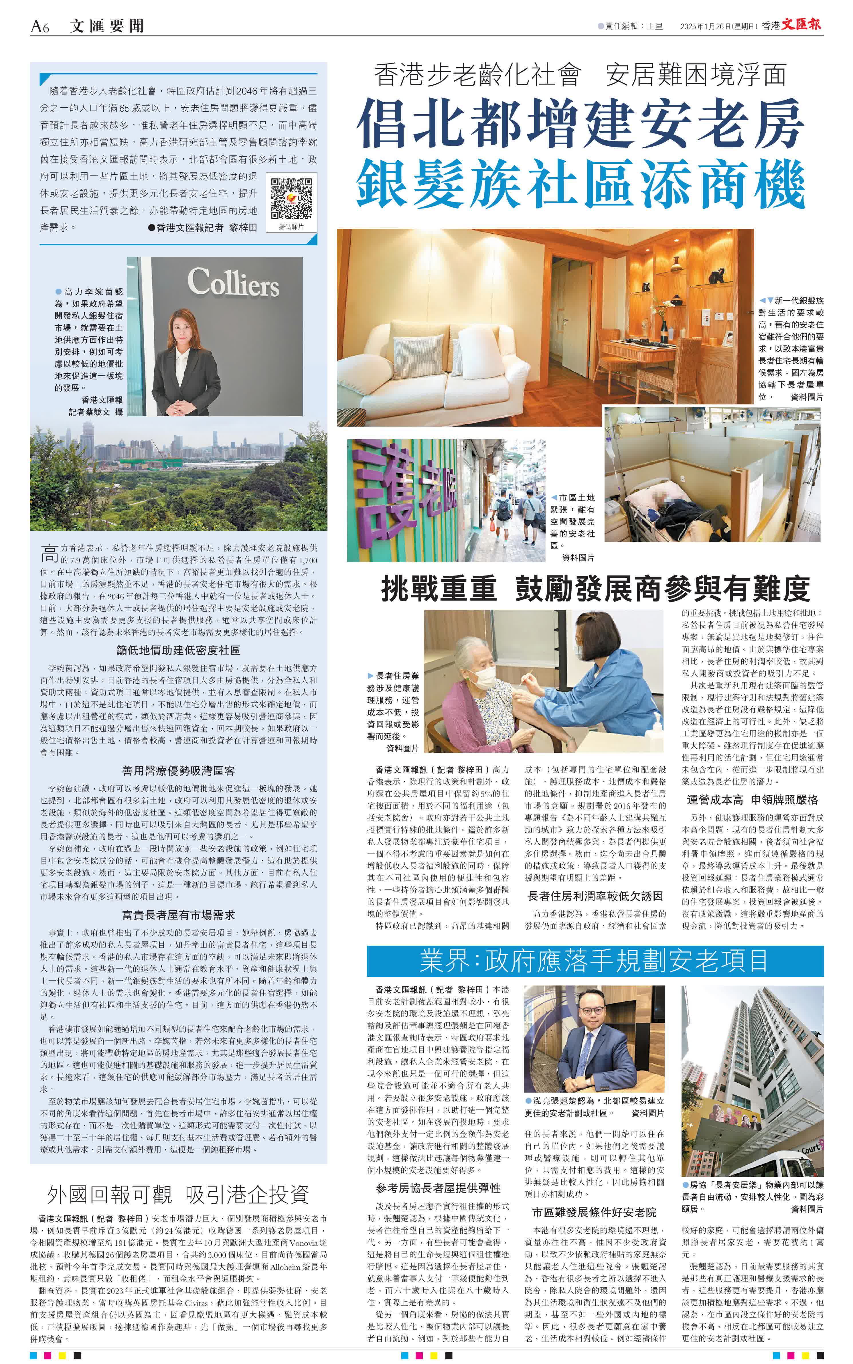 (香港文匯報記者 黎梓田)隨着香港步入老齡化社會,特區政府估計到2046年將有超過三分之一的人口年滿65歲或以上,安老住房問題將變得更嚴重。儘管預計長者越來越多,惟私營老年住房選擇明顯不足,而中高端獨立住所亦相當短缺。高力香港研究部主管及零售顧問諮詢李婉茵在接受香港文匯報訪問時表示,北部都會區有很多新土地,政府可以利用一些片區土地,將其發展為低密度的退休或安老設施,提供更多元化長者安老住宅,提升長者居民生活質素之餘,亦能帶動特定地區的房地產需求。