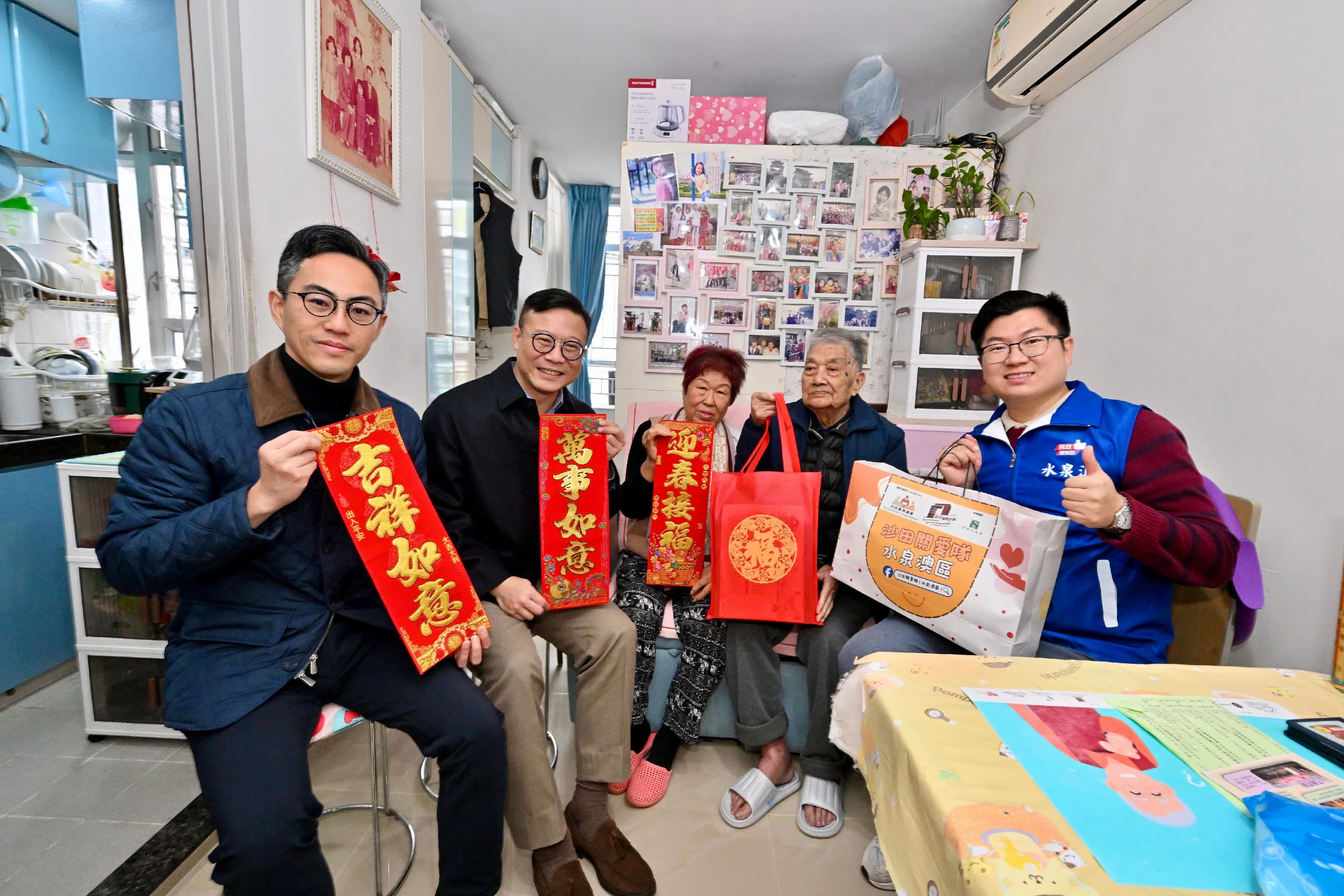 律政司副司長張國鈞在沙田民政事務專員余懷誠陪同下,聯同沙田區區議員和沙田區關愛隊代表探訪居於沙田水泉澳邨的基層家庭、長者家庭和獨居長者,了解他們的需要,與他們分享農曆新年的歡樂。