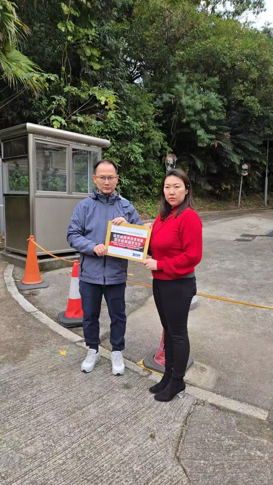 (大公文匯全媒體報道)1月25日,美國政府又有別有用心的政客提出所謂「法案」,要求檢視將多位香港特區政府官員,以及多位法官和檢控官列入所謂「制裁」名單,再次妄圖利用恐嚇的手段打擊維護國家安全人員,並抹黑香港國安法。民建聯副主席陳學鋒、立法會議員林琳,聯同多名民建聯區議員、青年民建聯成員,今日(26日)到美國駐港澳總領事館請願,對美國政府粗暴干涉香港事務表示強烈不滿和譴責,敦促美國政府立刻停止違反國際法和國際關係的行為。