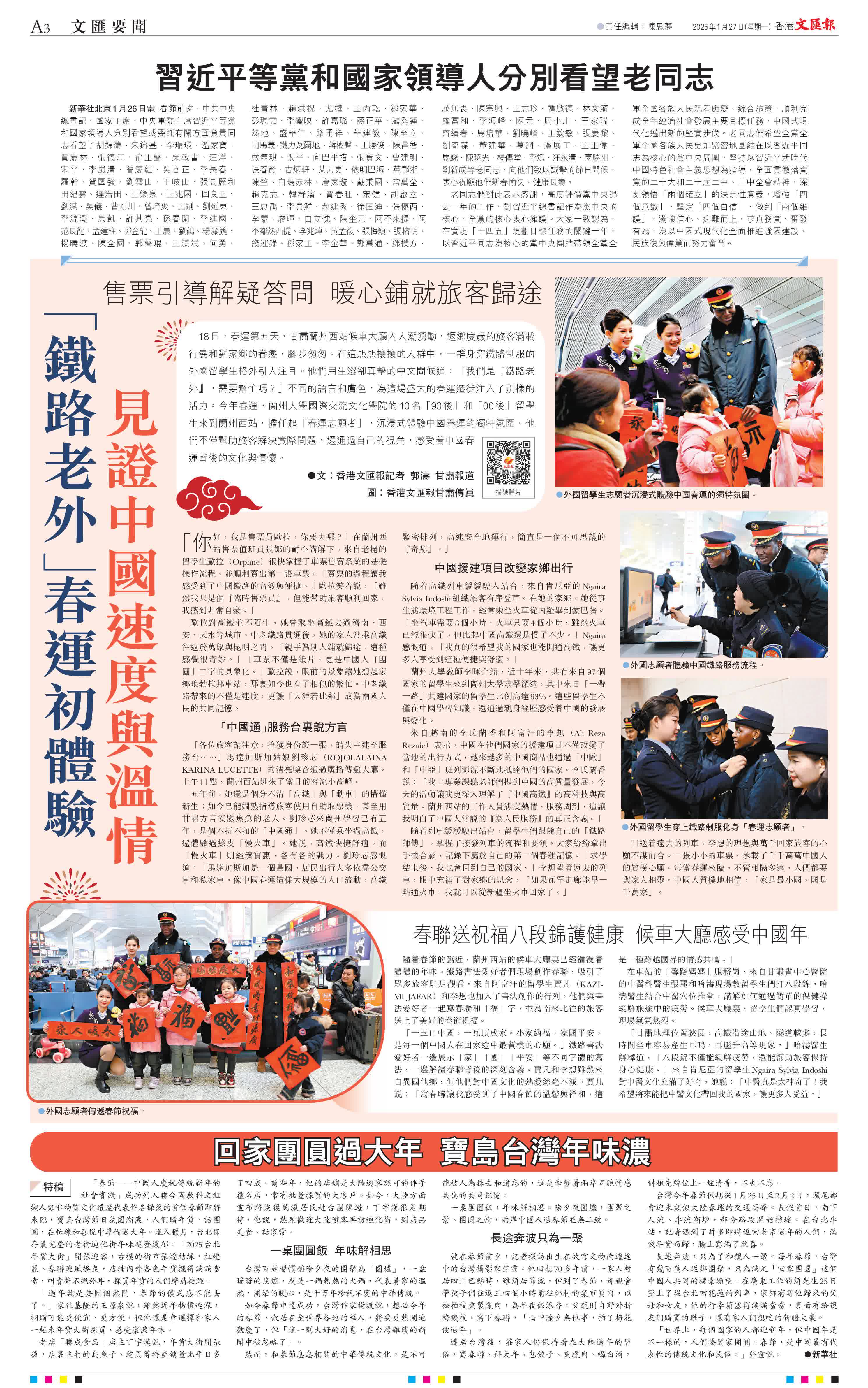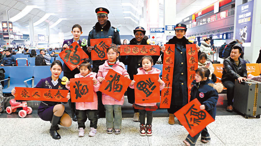 (香港文匯報記者 郭濤 甘肅報道)18日,春運第五天,甘肅蘭州西站候車大廳內人潮湧動,返鄉度歲的旅客滿載行囊和對家鄉的眷戀,腳步匆匆。在這熙熙攘攘的人群中,一群身穿鐵路制服的外國留學生格外引人注目。他們用生澀卻真摯的中文問候道:「我們是『鐵路老外』,需要幫忙嗎?」不同的語言和膚色,為這場盛大的春運遷徙注入了別樣的活力。今年春運,蘭州大學國際交流文化學院的10名「90後」和「00後」留學生來到蘭州西站,擔任起「春運志願者」,沉浸式體驗中國春運的獨特氛圍。他們不僅幫助旅客解決實際問題,還通過自己的視角,感受着中國春運背後的文化與情懷。