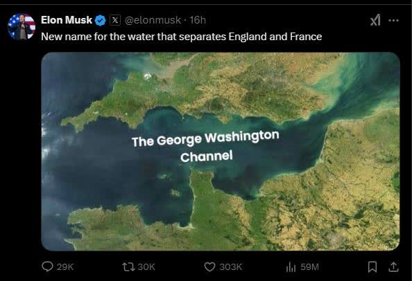 據中新網綜合報道,當地時間1月26日,美國企業家埃隆·馬斯克在社交平台上分享了一張圖片。圖片中,原本「英吉利海峽」的位置,被標記上「喬治·華盛頓海峽」字樣。馬斯克還配文稱,「英國和法國之間水域新名稱」。