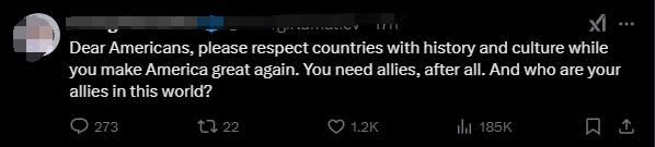 還有網友稱,「親愛的美國人,當你讓美國再次偉大的時候,請尊重有歷史和文化的國家。畢竟,你需要盟友。在這個世界上誰是你的盟友?」