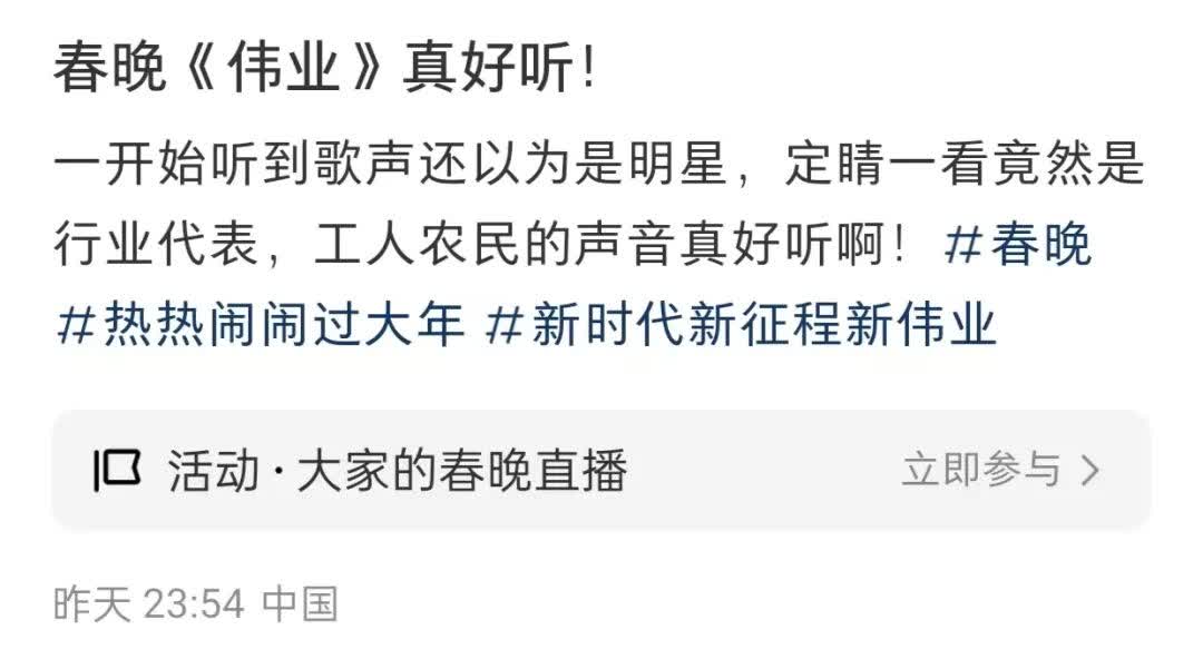 正如趙麟所說,大家每唱一次《偉業》,對這首歌的情感都會有一層新的理解和感受。早在第一次聽到農民歌手劉廣局唱出「愛的火焰永不熄滅」時,導演組就覺得一下燃起來了。萬家燈火的除夕春晚舞台上,他們的表演也讓不少網友點讚「看了特感動!這才是國家的基石」「大家都在各行各業發光」……
