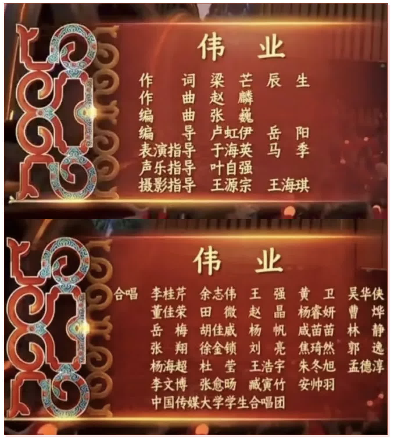 歌曲偉業時長3分45秒,在歌手們身後的大屏裏,從安徽黃山和北京慕田峪長城的壯美日出開始,94個視頻畫面一一展開,讓台上的歌手們彷彿置身畫中,有網友說「好像我過年在家和電視上的各地風光合影,足不出戶get氛圍感大片」。
