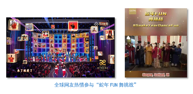 總台在海外社交媒體發起「蛇年FUN舞挑戰」新媒體互動活動,全球閱覽量4.06億,視頻觀看量2.32億,全球網友與中國歌手聯屏共舞《一起China Fun》。曾收到習近平主席覆信的南非德班理工大學孔子學院學生、英國格拉斯哥市副市長安·麥塔格特、德國知名文化博主羅伯特·阿道夫、俄羅斯花樣滑冰名將安娜·謝爾巴科娃 、捷克小提琴家及歌手姿娜、韓國傳統音樂家權泰慶、柬埔寨知名歌手哥薩瑪姍以及來自美國、加拿大、澳大利亞、法國、阿根廷、墨西哥、土耳其、印度、日本、沙特等70多個國家和地區的網友積極參與互動活動。