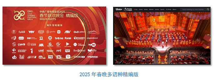 總台迅速譯配英語、法語、西班牙語、阿拉伯語、俄語、葡萄牙語、意大利語、捷克語、塔吉克語、日語、泰語等18個語種字幕解說,連續第四年打造春晚精編版節目,比去年新增7個語種,持續拓展春晚在地化深度傳播。自大年初一起,春晚精編版陸續在俄羅斯VK視頻平台、白俄羅斯文化廣播電台官網、巴西勞動者電視台、塔吉克斯坦希納摩電視台、印尼Vidio視頻網站、泰國電視五台、柬埔寨柬華時報網站、也門電視台、阿爾及利亞國家電視台、突尼斯國家電視台、南非德班電視台、馬裏國家電視台等65個國家和地區的156家媒體落播,較去年分別增長20%和12%。此外,春晚精編版還將在海外多國電影院線放映。