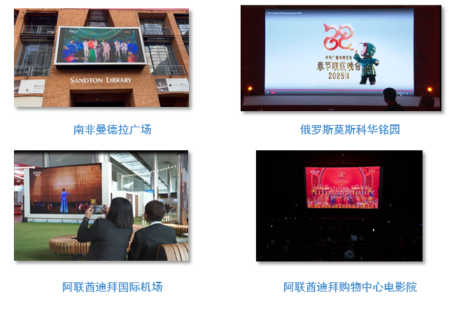 海外耀千屏。全球87個國家136座城市共計3508塊公共大屏直播和宣介總台春晚。南非約翰內斯堡坦博國際機場、南非曼德拉廣場、俄羅斯莫斯科華銘園、阿聯酋迪拜國際機場候機樓大廳、阿聯酋迪拜購物中心電影院等地大屏實時直播總台春晚,沉浸式感受中國春節、中華文化的獨特魅力。