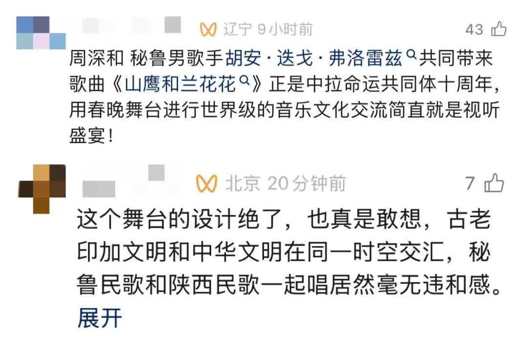 蛇年春晚舞台上,當中國歌手走向秘魯歌手,中秘民歌交織出天籟之音——「從中國到秘魯」的藝術呈現也有了更廣泛的解讀空間:用聲聲和鳴的歌,詮釋心心相印的情,呼喚走遍天下的友誼。從秘魯到拉美,再到全球南方……春晚舞台正在用美美與共的演繹,向全世界發送友愛的訊息。