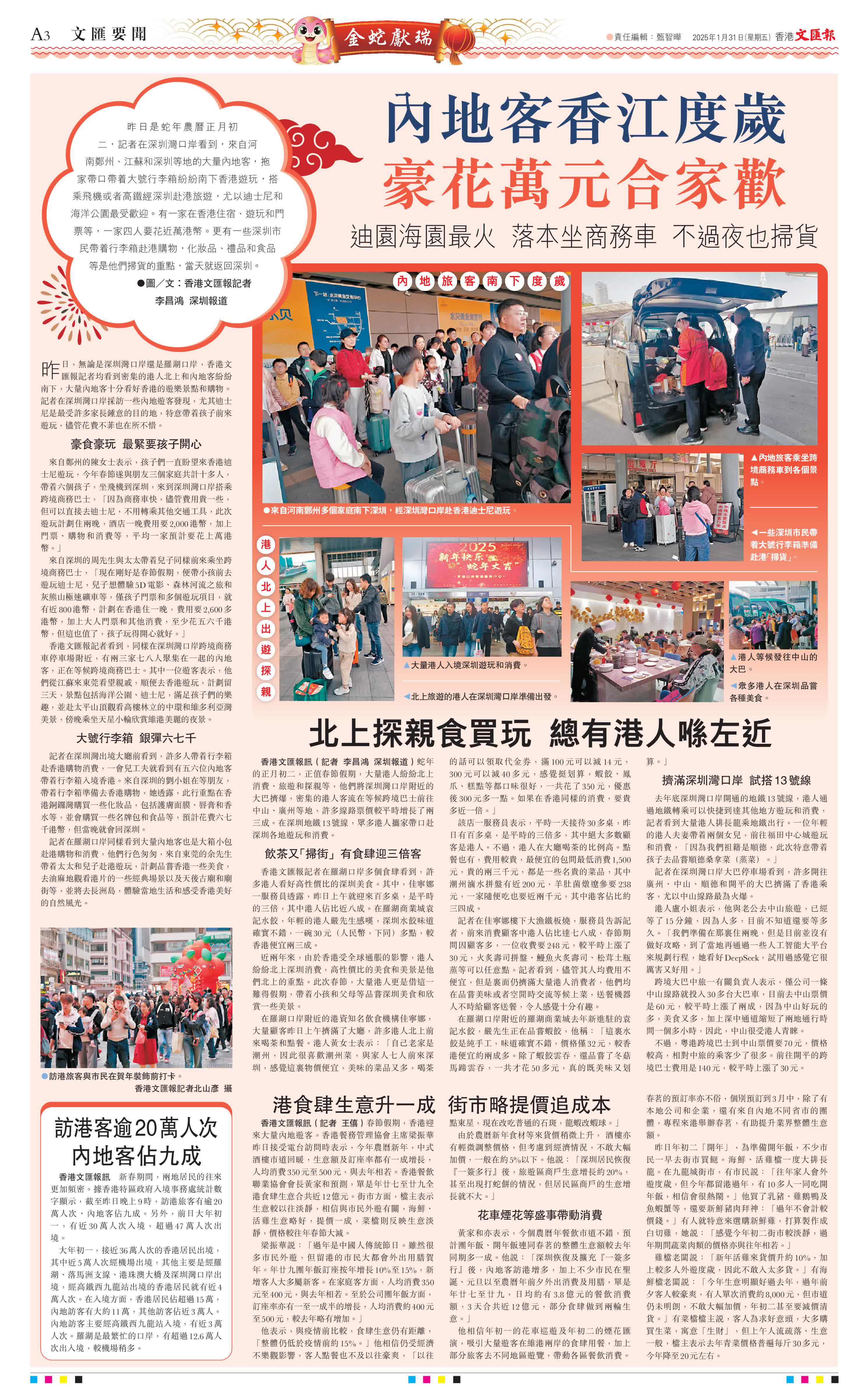 新春期間,兩地居民的往來更加頻密。據香港特區政府入境事務處統計數字顯示,截至昨日晚上9時,訪港旅客有逾20萬人次、內地客佔九成。另外,前日大年初一,有近30萬人次入境,超過47萬人次出境。