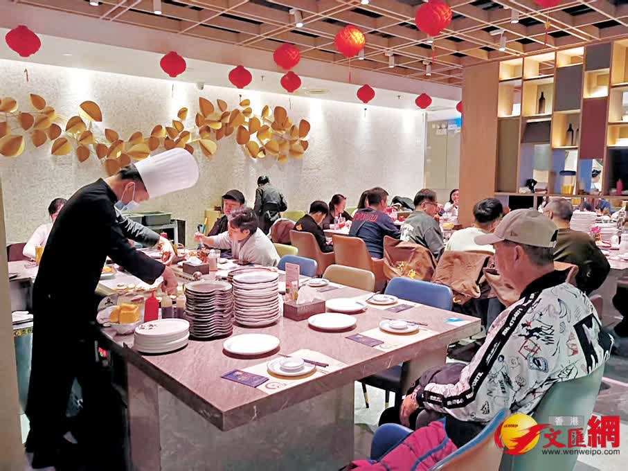 記者在佳寧娜樓下大漁鐵板燒,服務員告訴記者,前來消費顧客中港人佔比達七八成,春節期間因顧客多,一位收費要248元,較平時上漲了30元,火炙壽司拼盤、鰻魚火炙壽司、松茸土瓶蒸等可以任意點。記者看到,儘管其人均費用不便宜,但是裏面仍擠滿大量港人消費者,他們均在品嘗美味或者空閒時交流等候上菜,送餐機器人不時給顧客送餐,令人感覺十分有趣。