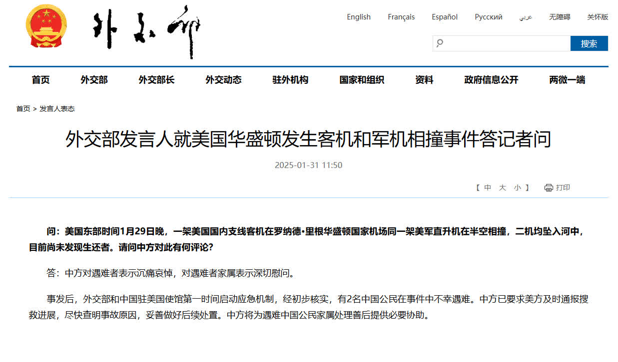 問:美國東部時間1月29日晚,一架美國國內支線客機在羅納德·里根華盛頓國家機場同一架美軍直升機在半空相撞,二機均墜入河中,目前尚未發現生還者。請問中方對此有何評論?