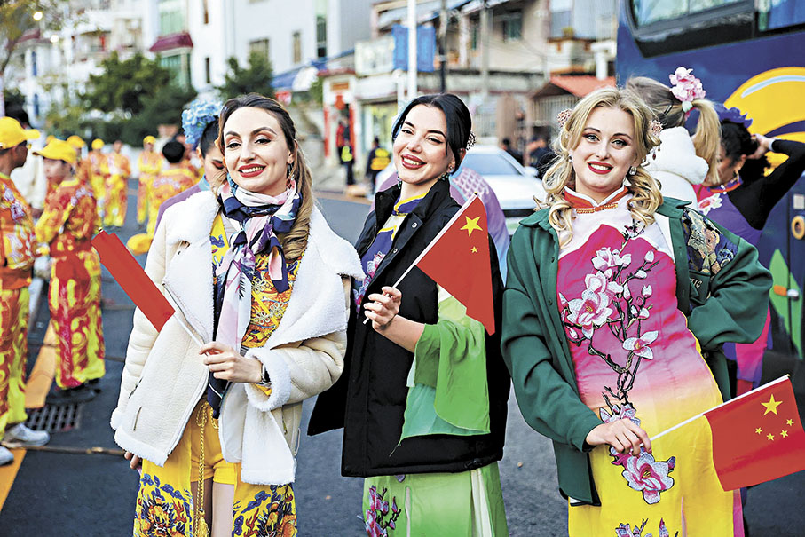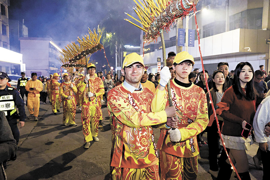 舞草龍的隊伍中還有不少外國友人,他們臉上洋溢着興奮和好奇的神情。「舞草龍太有趣了,是一種非常獨特的文化體驗。在中國,龍代表着強大和吉祥,我能參與其中,感覺像是深入了解了中國文化的精髓。」一位來自西班牙的友人表示,南澳舞草龍獨特的魅力深深吸引着她。當地的非遺項目漁民娶親表演師傅也熱情地歡迎外國友人的加入,她們一邊展示着舞蹈技巧,一邊向外國友人講述漁民娶親背後的故事和文化內涵,不同文化背景的人們相互交流、相互學習。
