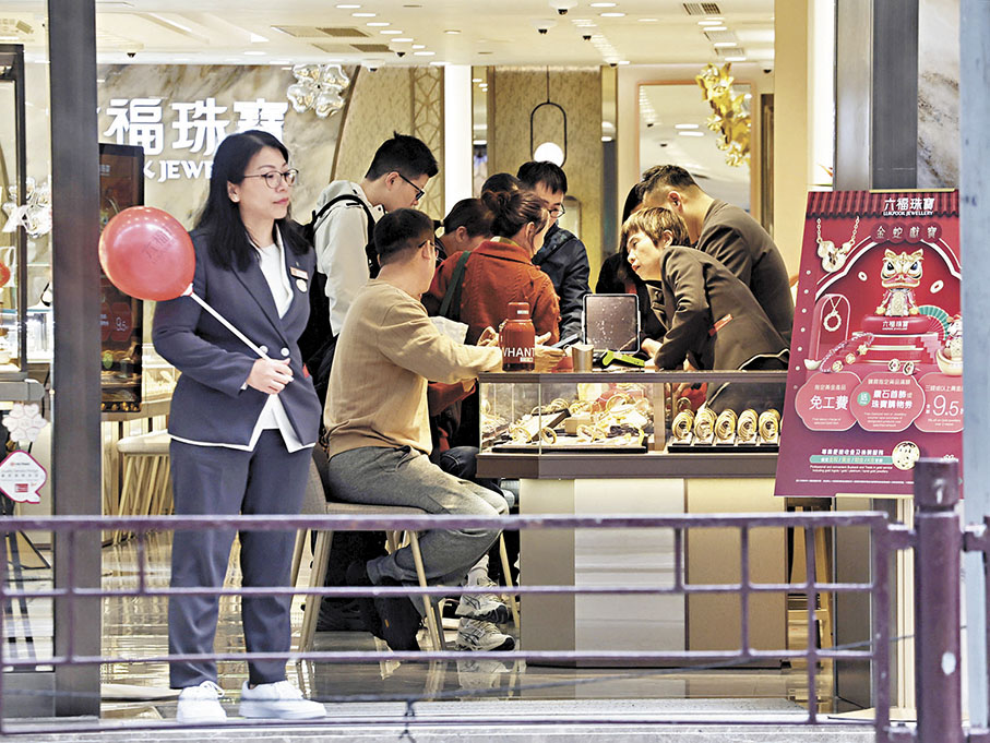 九龍珠石玉器金銀首飾業商會監事長劉克斌表示,受惠於深圳恢復及擴充「一簽多行」等措施,遊客區珠寶店的訪港旅客明顯增加,惟近年金價高企,部分消費者採取觀望態度,預期今個新年整體生意額較去年同期少10%。