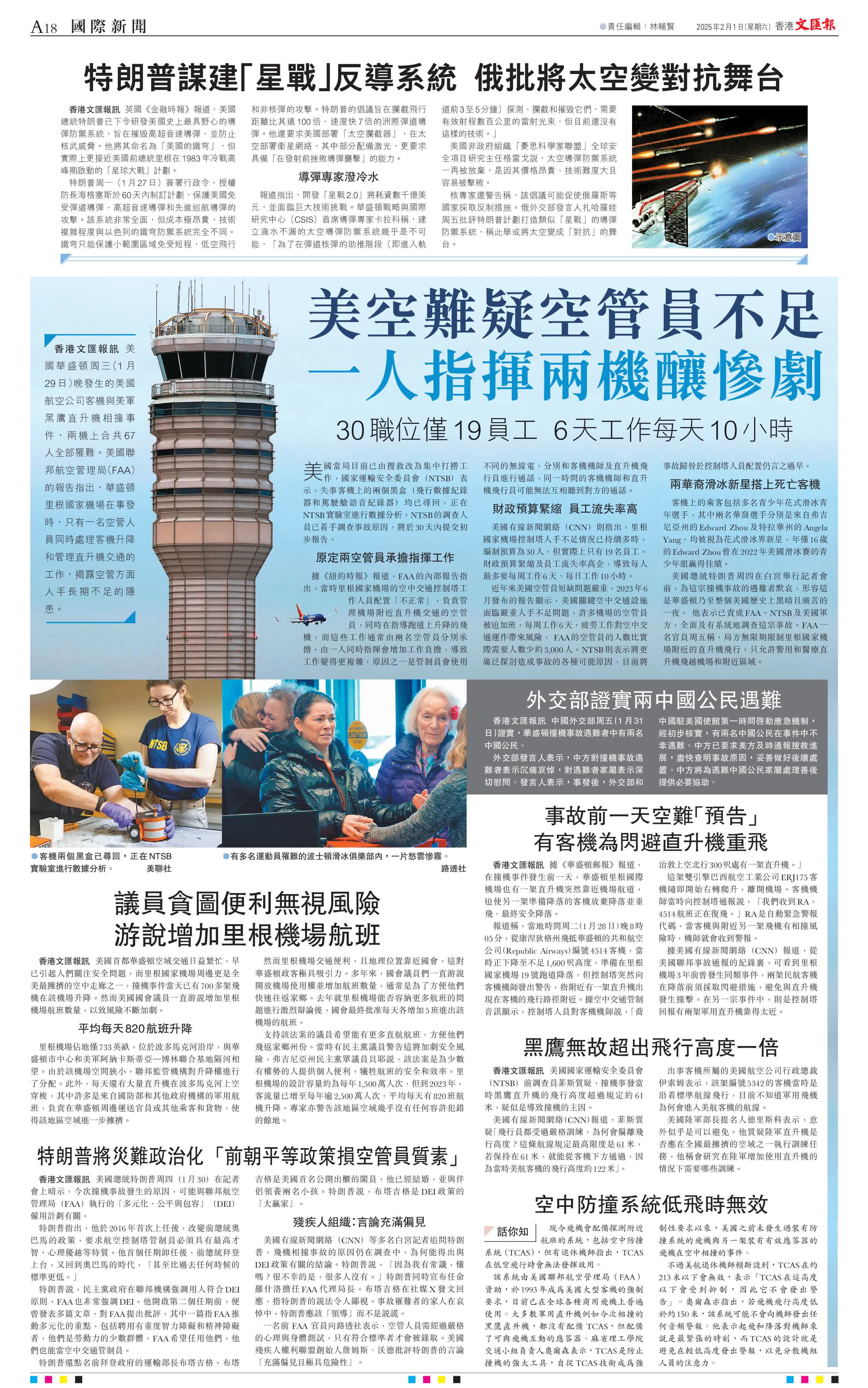 香港文匯報訊 美國華盛頓周三(1月29日)晚發生的美國航空公司客機與美軍黑鷹直升機相撞事件,兩機上合共67人全部罹難。美國聯邦航空管理局(FAA)的報告指出,華盛頓里根國家機場在事發時,只有一名空管人員同時處理客機升降和管理直升機交通的工作,揭露空管方面人手長期不足的隱患。
