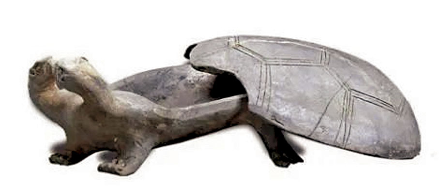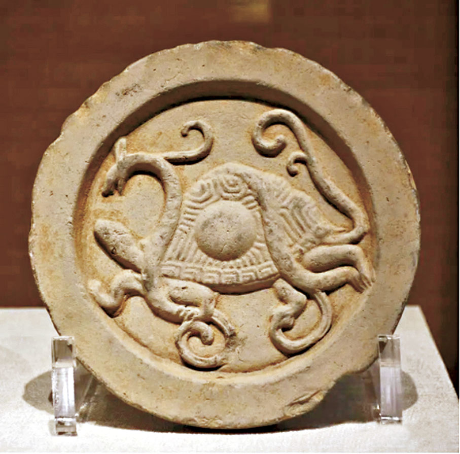 珍藏於陝西省考古研究院的「灰陶玄武硯」,為漢代文房用具,出土時硯內還似殘留墨痕。據介紹,青龍、白虎、朱雀、玄武作為中國傳統文化中的「四象」,分別代表着東、西、南、北四個方向和春、夏、秋、冬四個季節,也稱四神。其中玄武代表北方和冬季,為龜和蛇的合體。專家表示,龜代表穩健和長壽,蛇則象徵着神秘和靈動,二者結合,寄託着人們對長壽和智慧的祈願。這件龜形硯陶質堅密,造型拙樸,富於稚趣,是漢代同類硯中的精品。