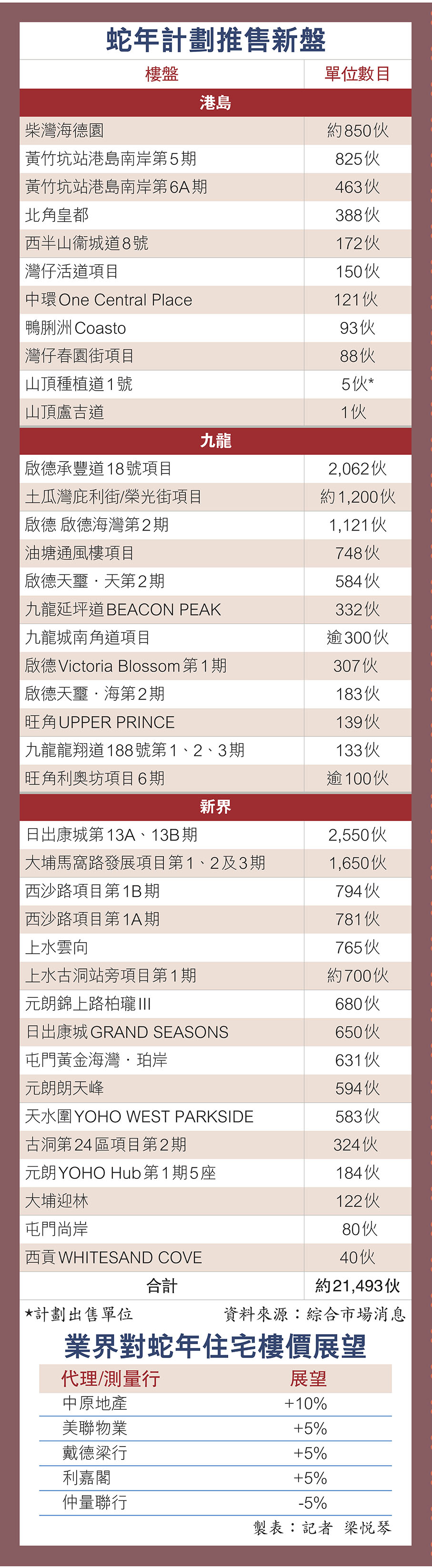 乙巳蛇年雙春逢閏月,寓意好事連連生機勃勃,適逢香港主要銀行去年已累減息0.625厘,近期銀行按揭取態轉趨積極,部分銀行重推貸款現金回贈,市場普遍預期今年樓市氣氛將有所改善,發展商加快推售新盤以去庫存。市場數據顯示,全港至少有39個全新盤登場,合共提供逾2.14萬伙住宅單位。當中,九龍東啟德區(5個新盤共4,257伙)、將軍澳日出康城(2個新盤共3,200伙)及北部都會區(6個新盤共3,247伙)成為供應重點區,合計佔全港約一半新盤單位。 ●香港文匯報記者 梁悅琴