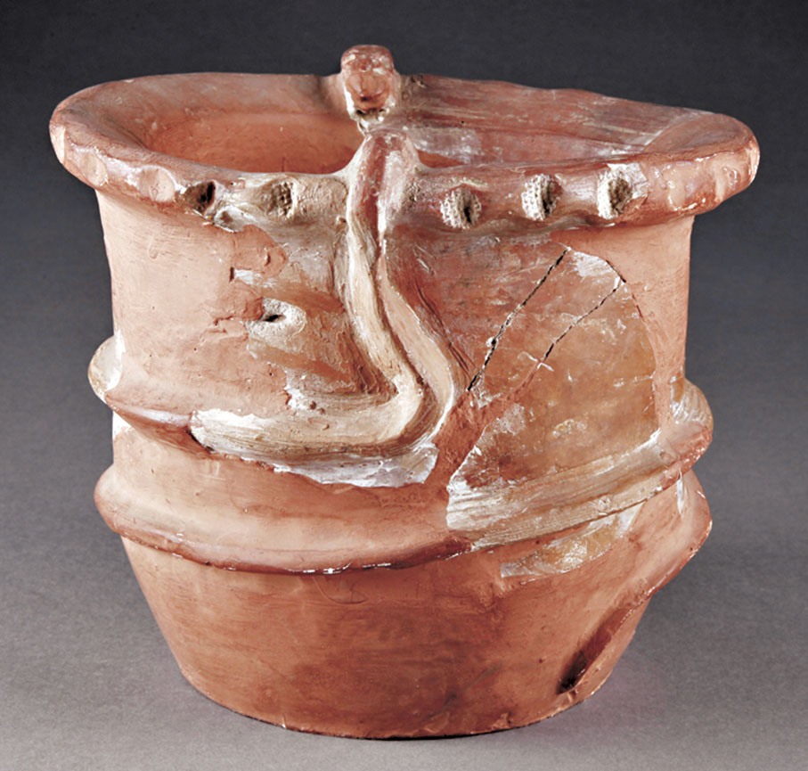 隨着時間的推移,先民對蛇的敬畏與崇拜日益增長,蛇的形象更多地出現在石雕、陶罐、陶豆等器物上,甚至裝飾在日常使用的炊具上。保存於陝西省考古研究院的「蛇紋鬲」,為商代晚期炊器。這件蛇紋鬲夾砂灰陶,通體飾細繩紋,口唇外飾一周鋸齒狀附加堆紋,三足上部和鬲的襠部各飾一道豎向波折形附加堆紋,也被稱為「蛇紋」。