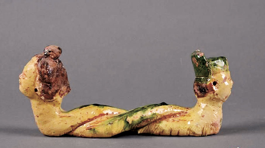 在陝西的博物館裏,一些看似尋常的生活用具因蛇元素的融入,而增添一份靈動和神秘的氣息。陝西歷史博物館館藏「新石器時代貼塑蛇紋罐」,罐高15.5厘米,罐身兩側貼塑兩條蛇紋,兩蛇反向纏繞於罐身,兩蛇頭露出罐口,相向對視。造型簡樸,卻栩栩如生。蛇紋貼塑既讓陶罐增加了實用性,又讓平凡的日子增添了藝術觀賞性。