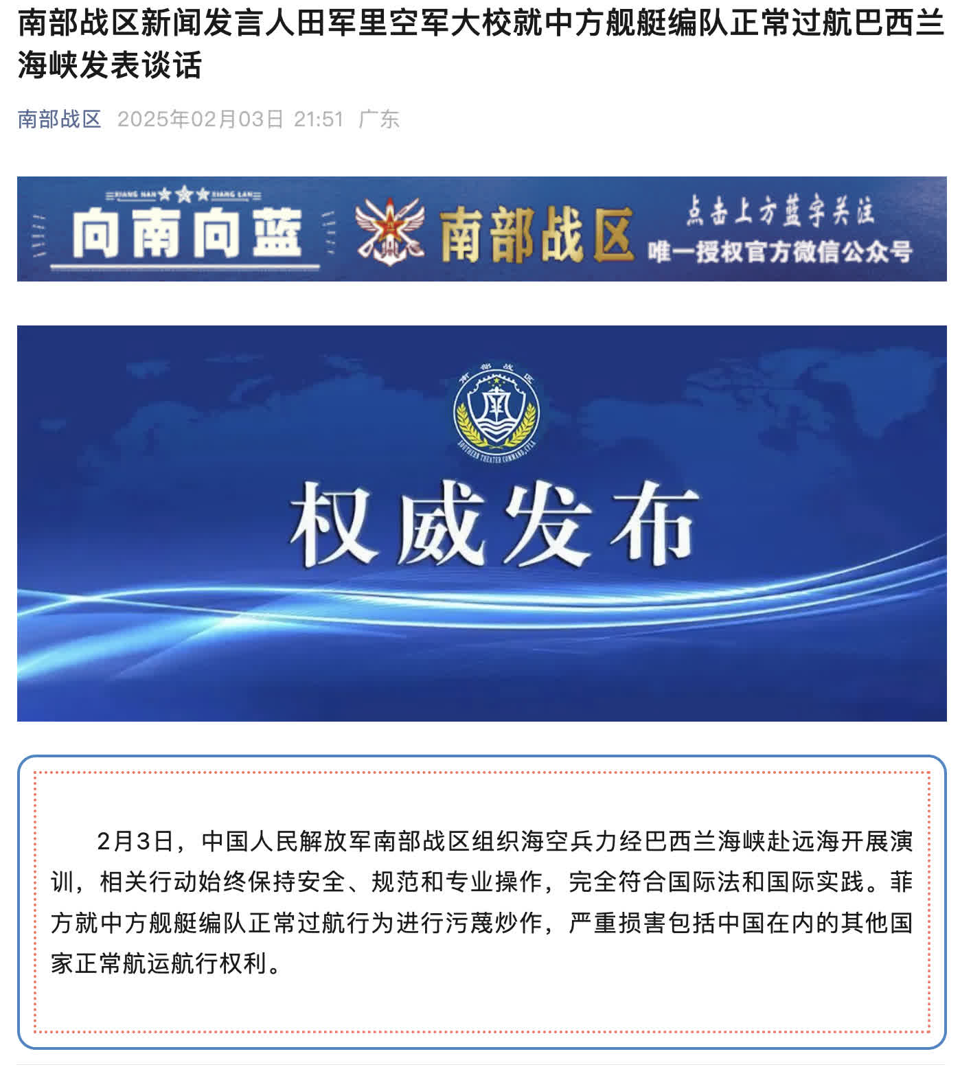 2月3日,中國人民解放軍南部戰區組織海空兵力經巴西蘭海峽赴遠海開展演訓,相關行動始終保持安全、規範和專業操作,完全符合國際法和國際實踐。菲方就中方艦艇編隊正常過航行為進行污衊炒作,嚴重損害包括中國在內的其他國家正常航運航行權利。
