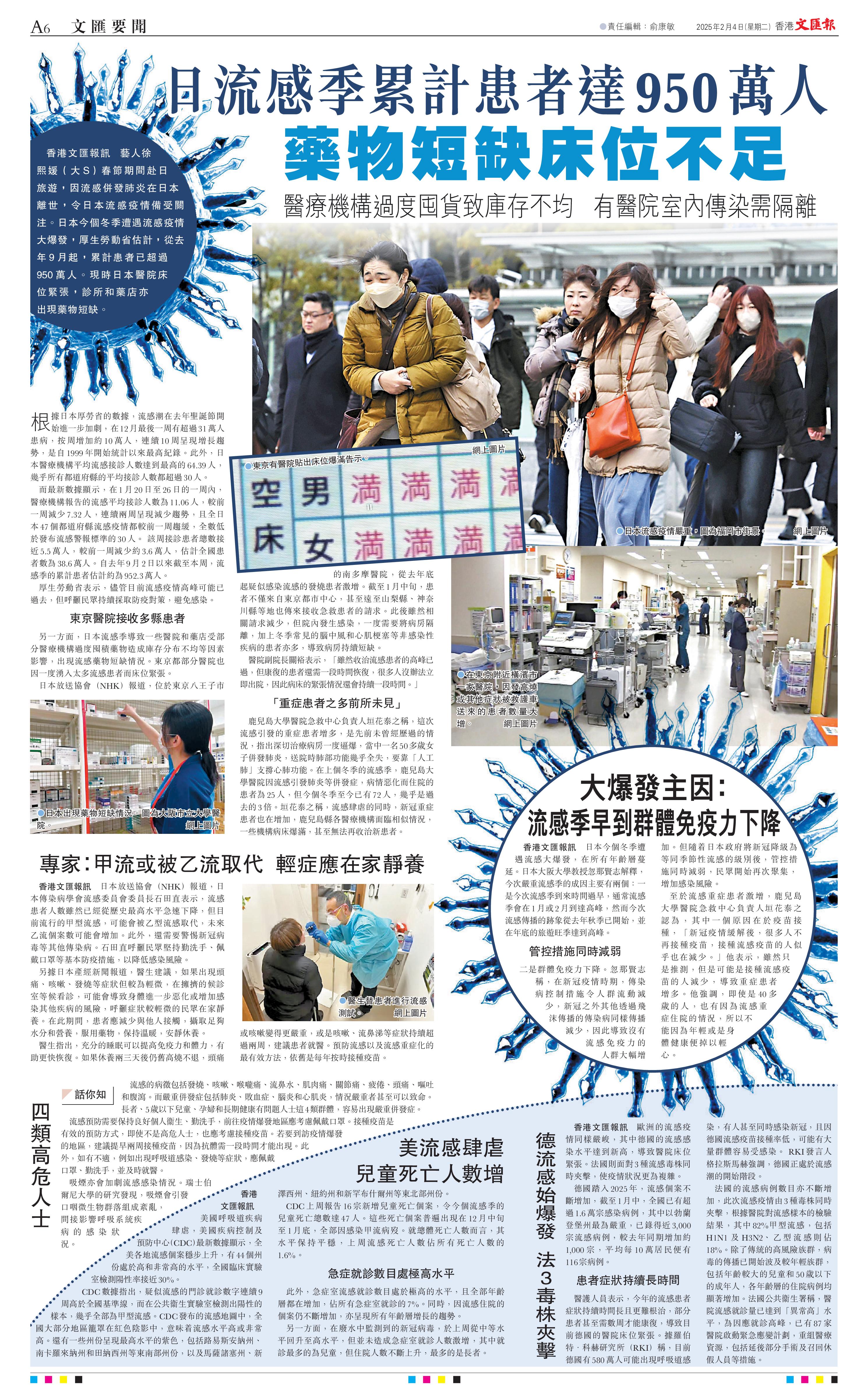 香港文匯報訊 藝人徐熙媛(大S)春節期間赴日旅遊,因流感併發肺炎在日本離世,令日本流感疫情備受關注。日本今個冬季遭遇流感疫情大爆發,厚生勞動省估計,從去年9月起,累計患者已超過950萬人。現時日本醫院床位緊張,診所和藥店亦出現藥物短缺。