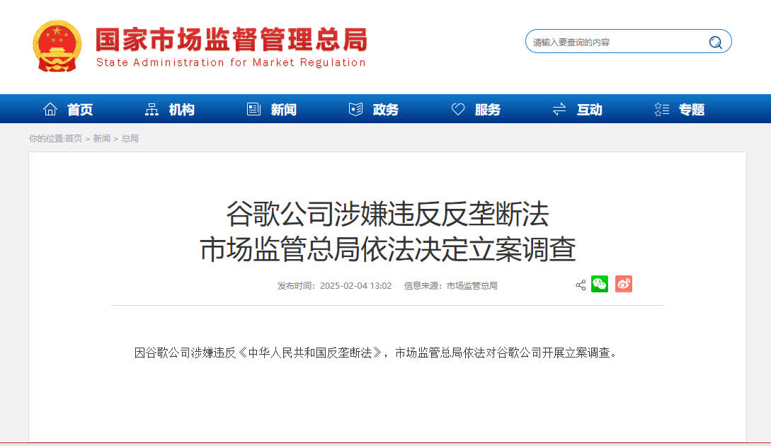 據市場監管總局網站消息,因谷歌公司涉嫌違反《中華人民共和國反壟斷法》,市場監管總局依法對谷歌公司開展立案調查。