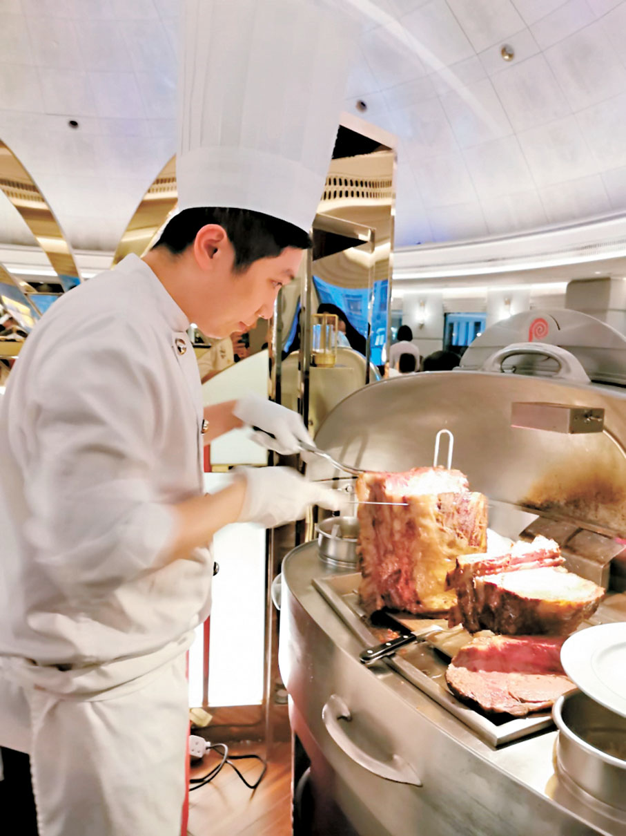 壓軸的「特級燒牛肉」則配以賀蘭魂英雄版珍藏2018及華昊馬瑟蘭家族珍藏,其細膩單寧與牛肉的鮮嫩口感相映成趣。餐廳嚴選美國黑毛安格斯牛肉,經過濕式熟成後以原條牛肋骨扒慢燒最少四小時,再放入恒溫60度的保溫櫃,讓牛肉「慢煮」6小時。廚師會推着餐車到食客前,依照客人不同需求提供五種分切,是饕客趨之若鶩的城中燒牛肉首選!