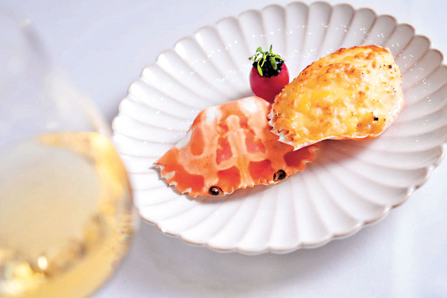 開胃菜「龍蝦柚子泡沫」以新鮮龍蝦肉配上時令柚子,清新怡人,與長和翡翠珍藏霞多麗的柑橘及杏的香氣相得益彰,為饕客打開味蕾。第二道是「法式芝士白酒焗蟹蓋」,廚師細心將四隻越南花蟹拆肉,釀入一個蟹蓋之中,並以白汁及車打芝士烘焗,佐以西鴿N28霞多麗,讓酒的奶油香氣與芝士融合。