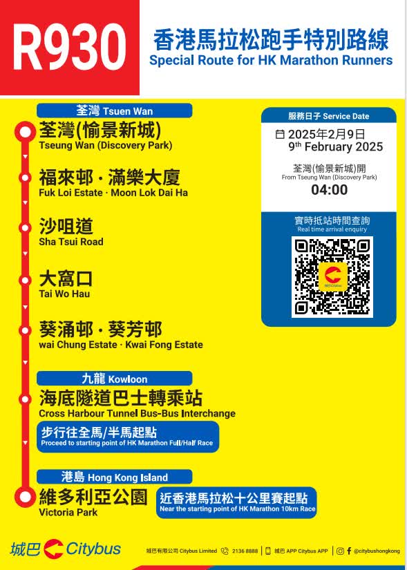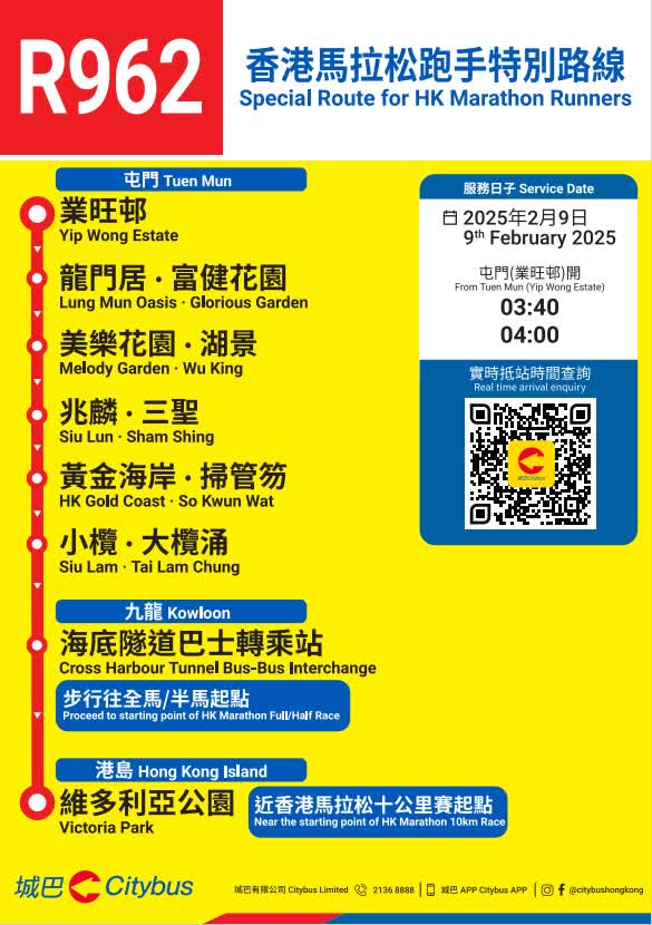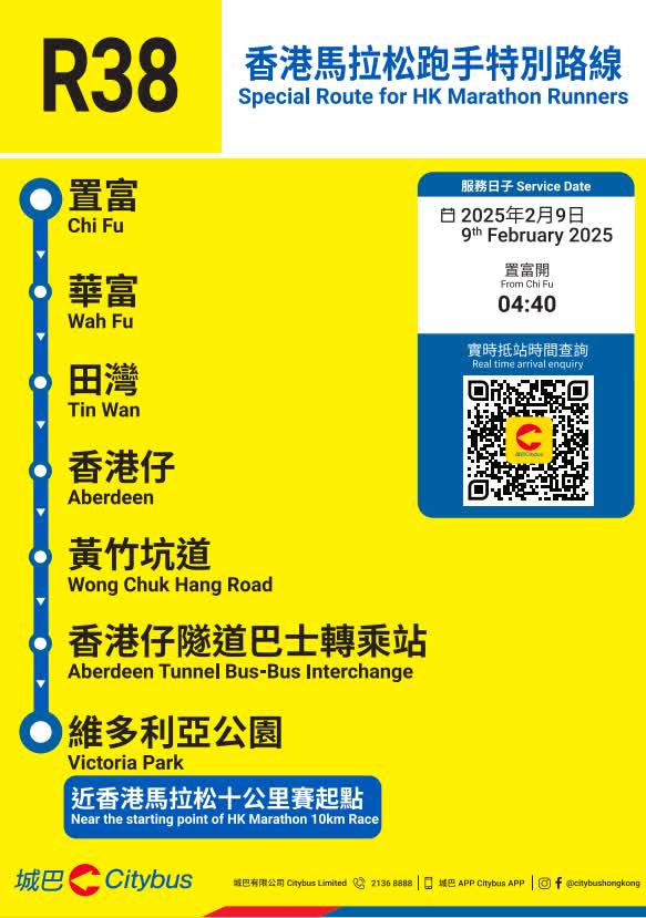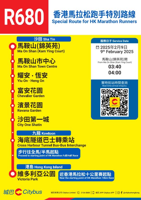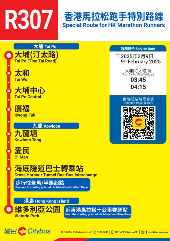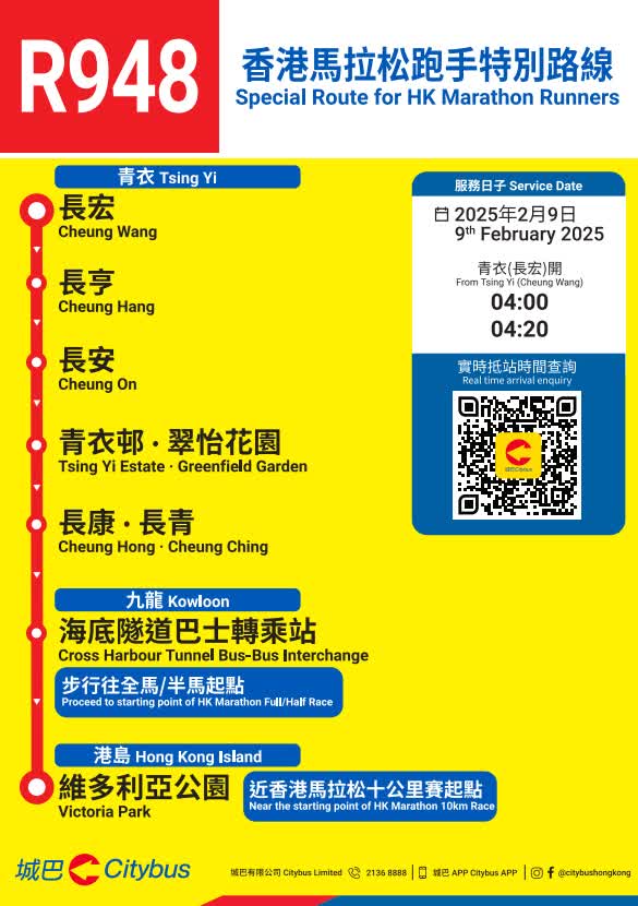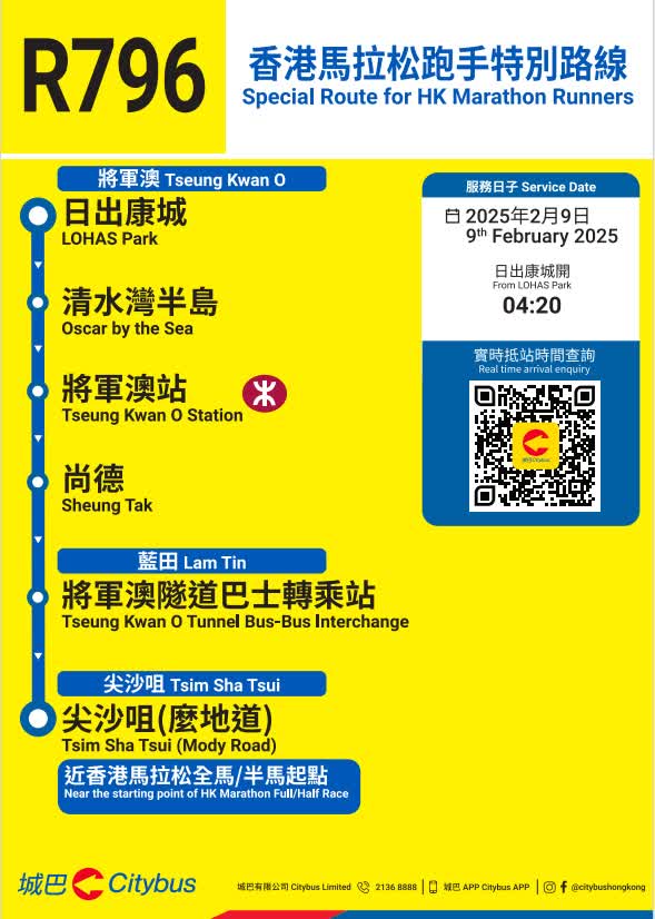 因應賽事當日的臨時封路及改道安排,城巴多條路線將會改道行駛及/或臨時遷移巴士站,城巴將因應實際情況調整服務,請顧客預留額外乘車時間。顧客如要查詢個別路線的改道詳情及臨時巴士站安排,可使用城巴手機應用程式直接輸入巴士路線查詢。顧客亦請留意張貼於巴士站的通告及現場警方指示。